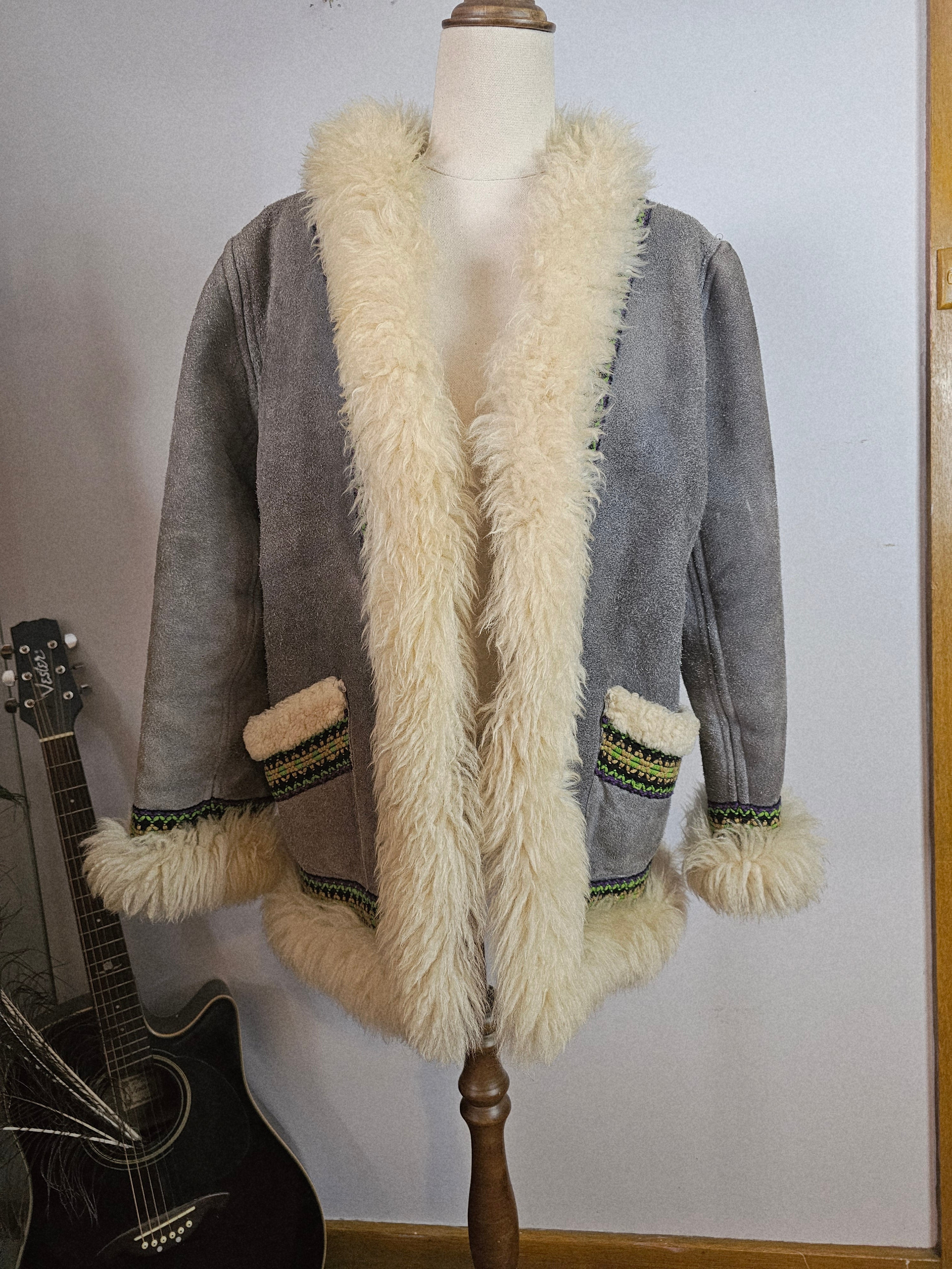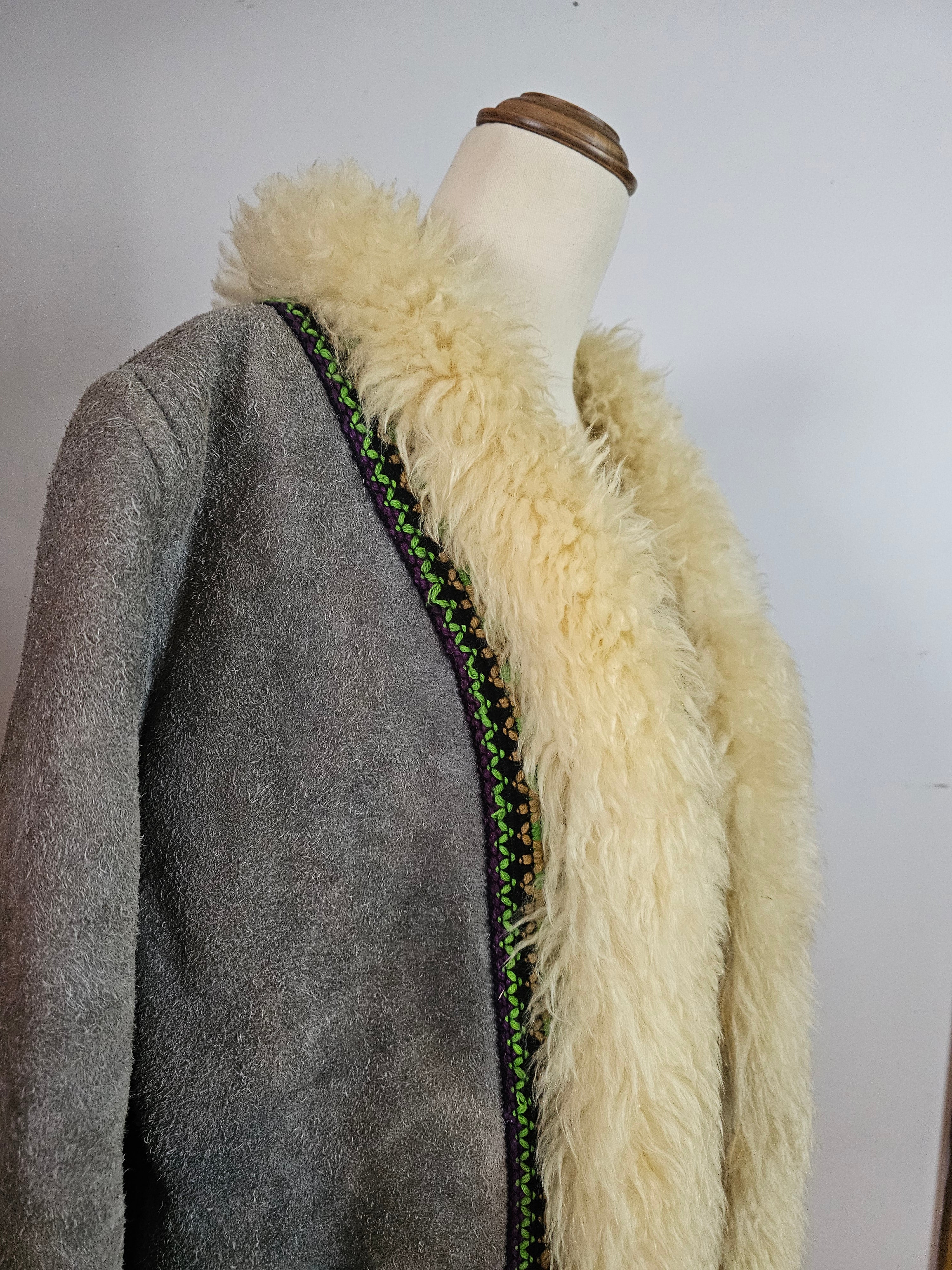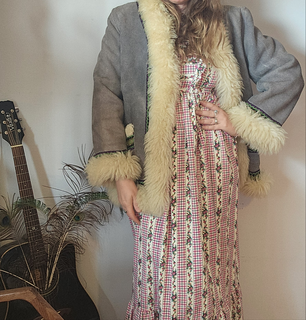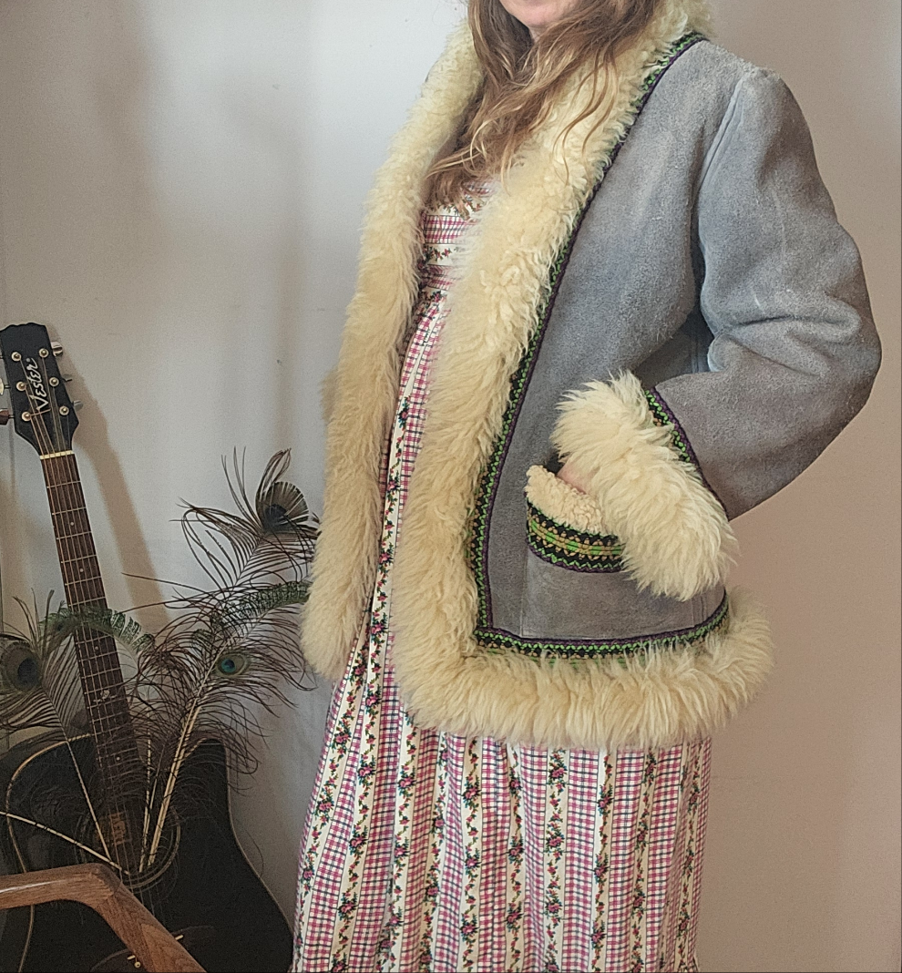Snug like a mountain hug, this vintage gem brings full 70s soul with its creamy thick shearling trim and slate grey suede shell. Trimmed with woven folk-inspired ribbon in vibrant greens and purples, she’s earthy, bold, and made to be lived in.