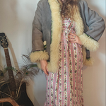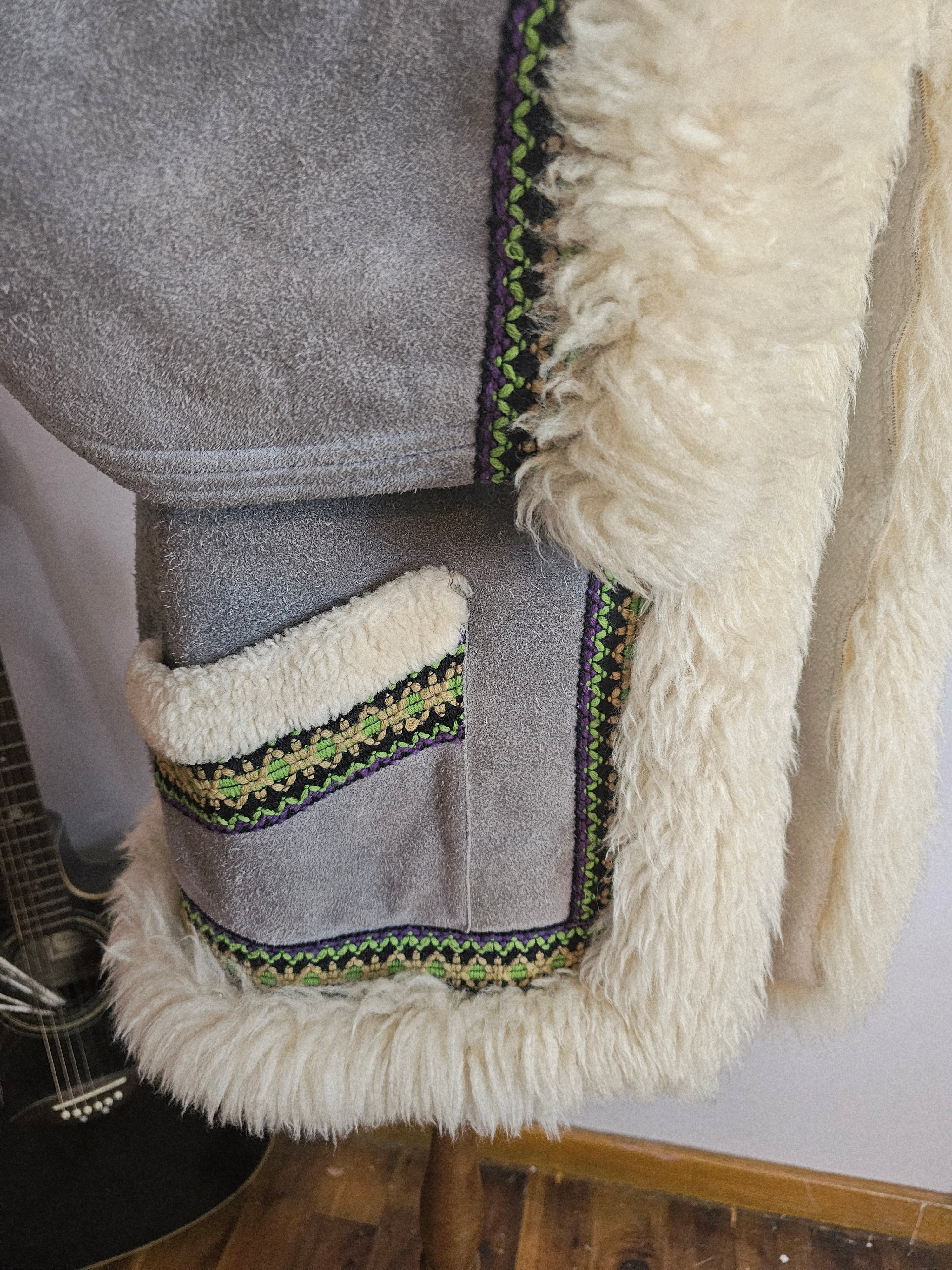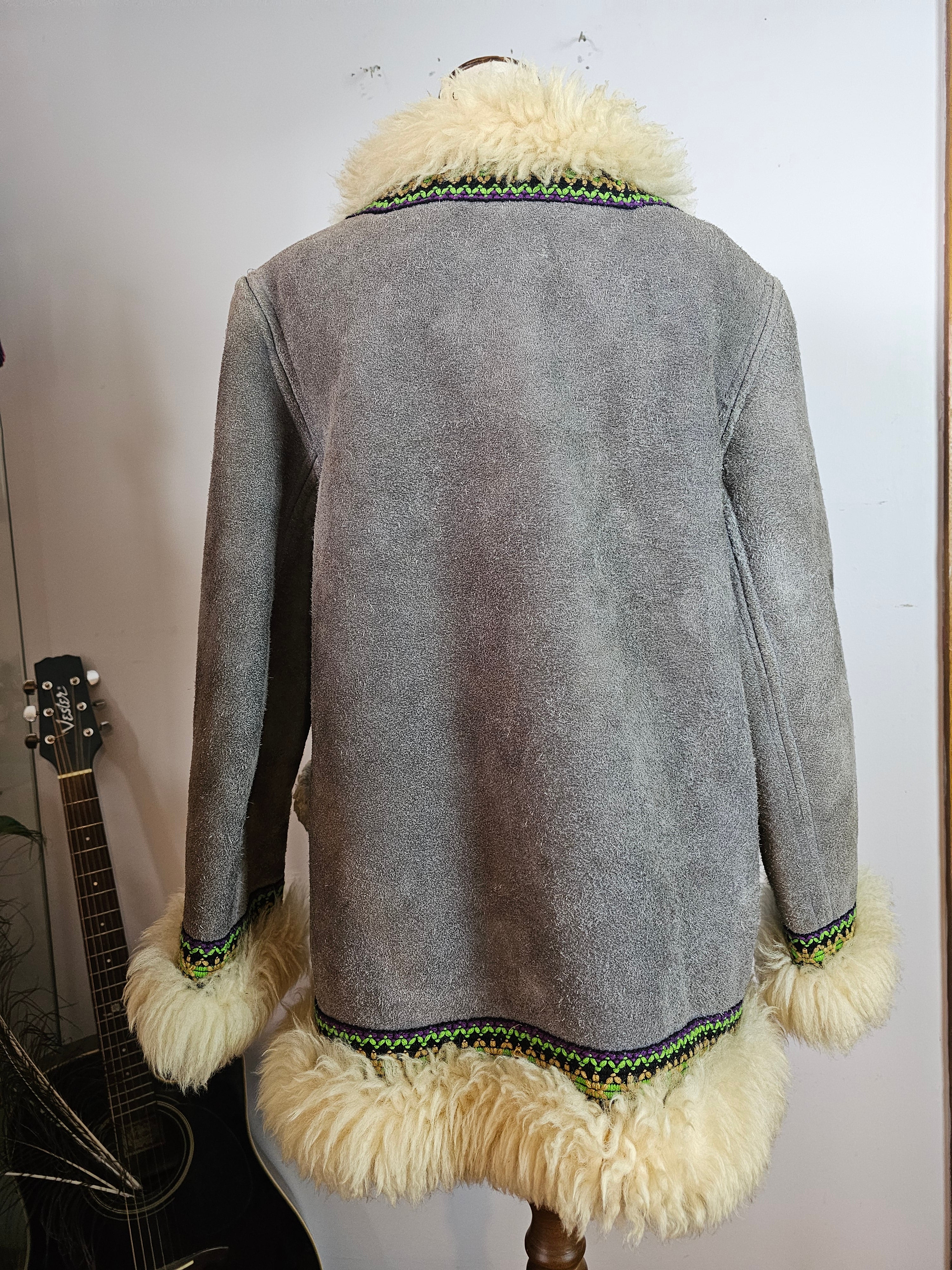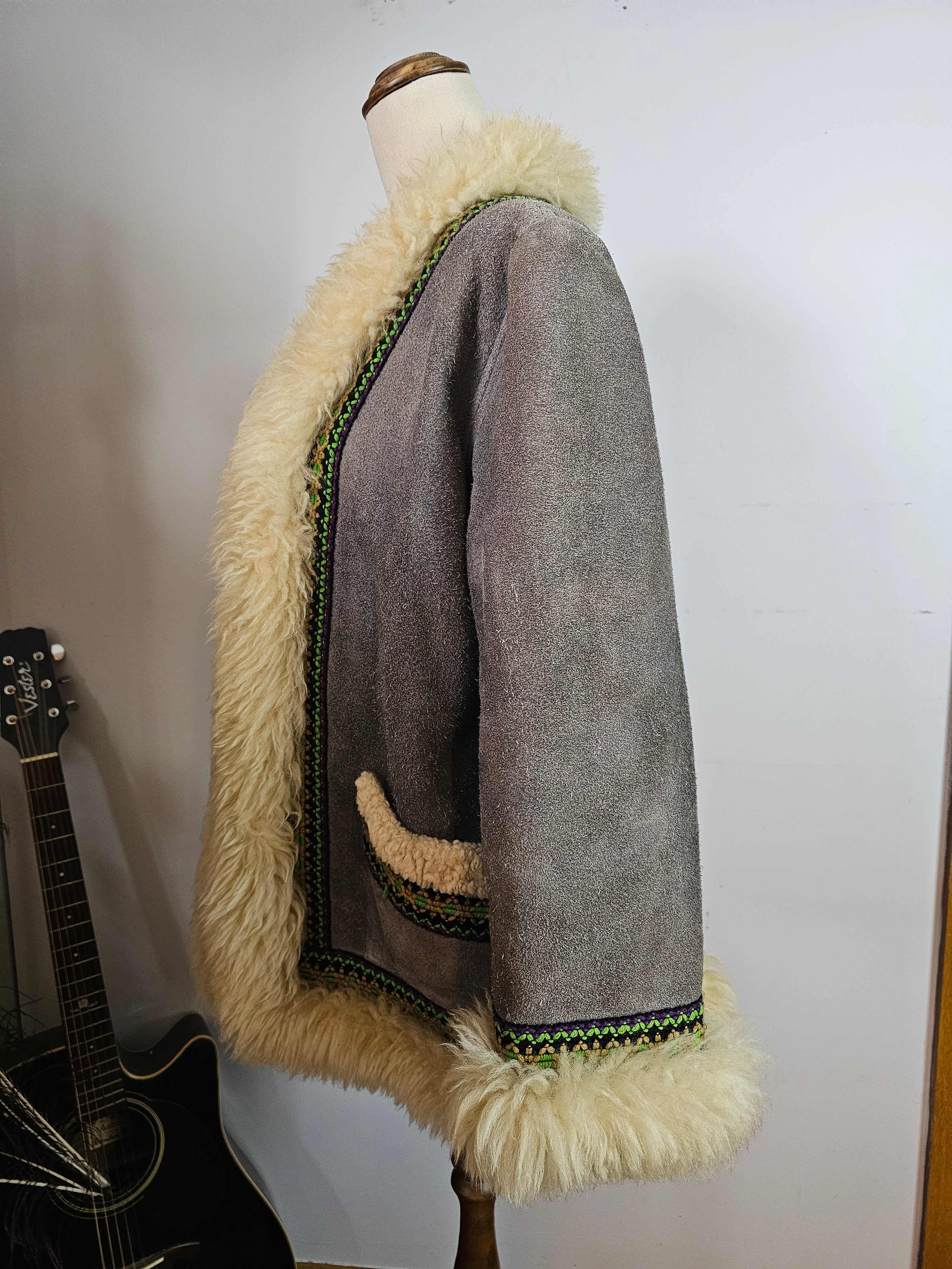 Snug like a mountain hug, this vintage gem brings full 70s soul with its creamy thick shearling trim and slate grey suede shell. Trimmed with woven folk-inspired ribbon in vibrant greens and purples, she’s earthy, bold, and made to be lived in.