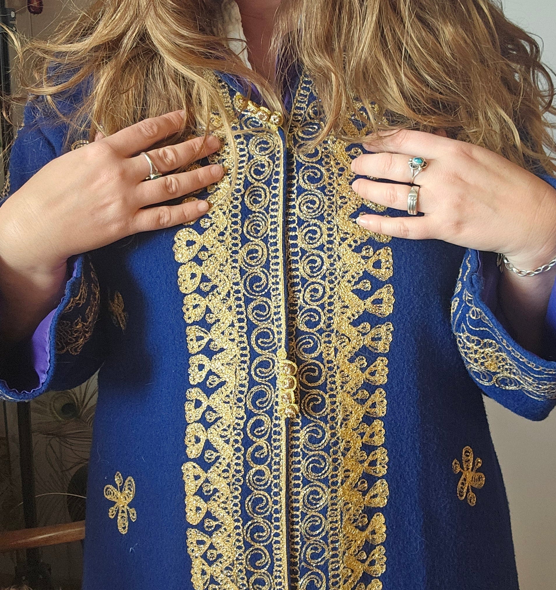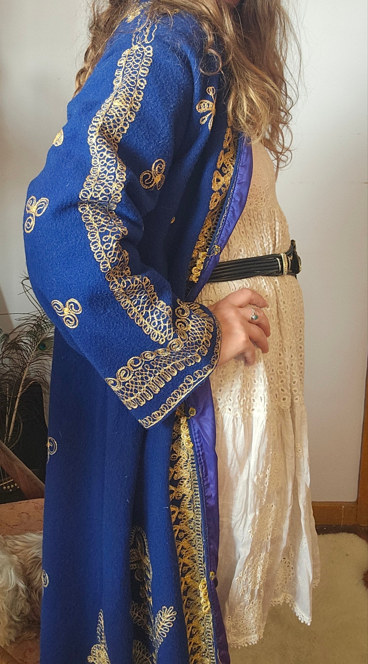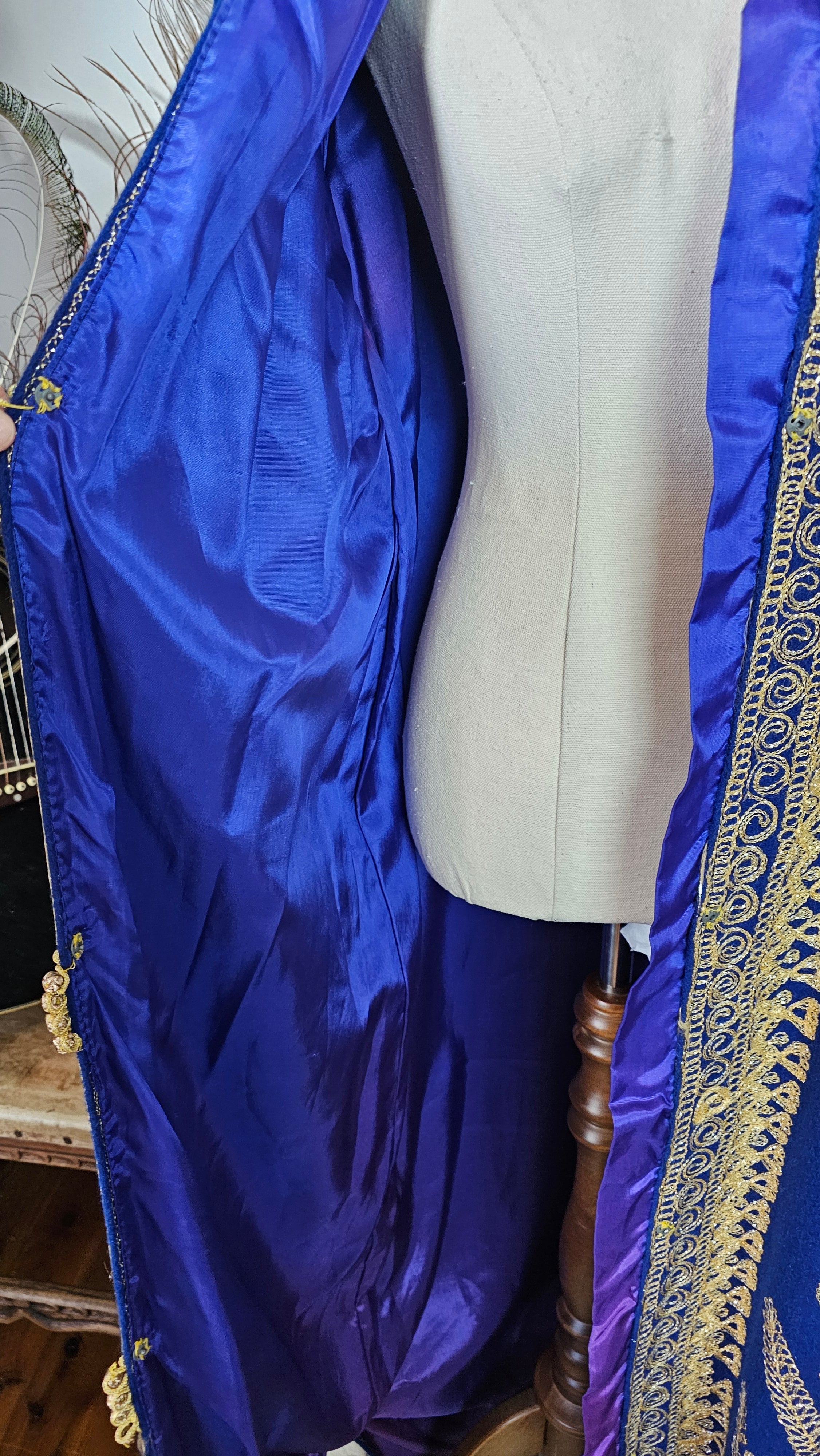 This isn’t just a coat—it’s a statement. With rich royal blue fabric and opulent gold embroidery, this vintage robe is steeped in dramatic charm and boho regality. Fully lined in satin purple with ornate detailing throughout, it’s perfect for festivals, photoshoots, or that one piece that turns heads the moment you walk in.