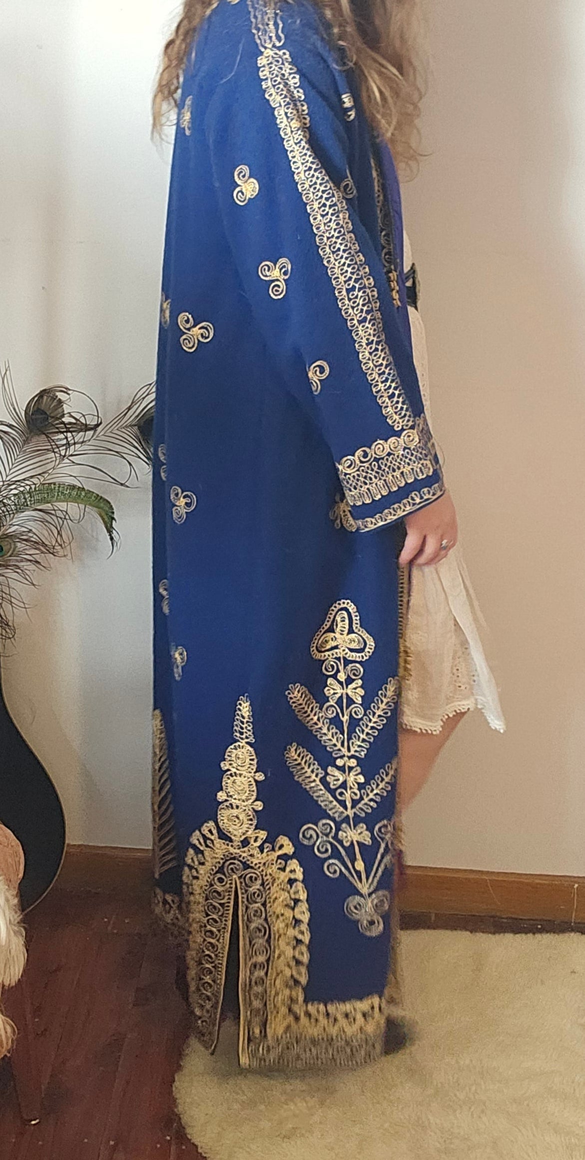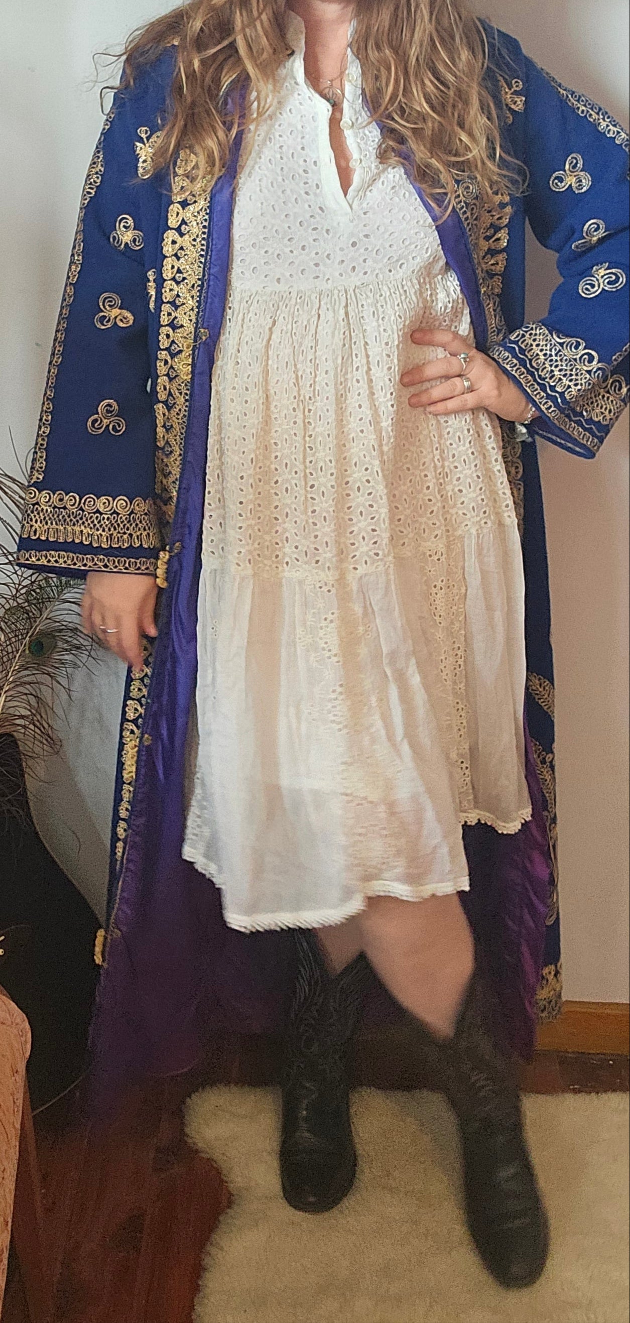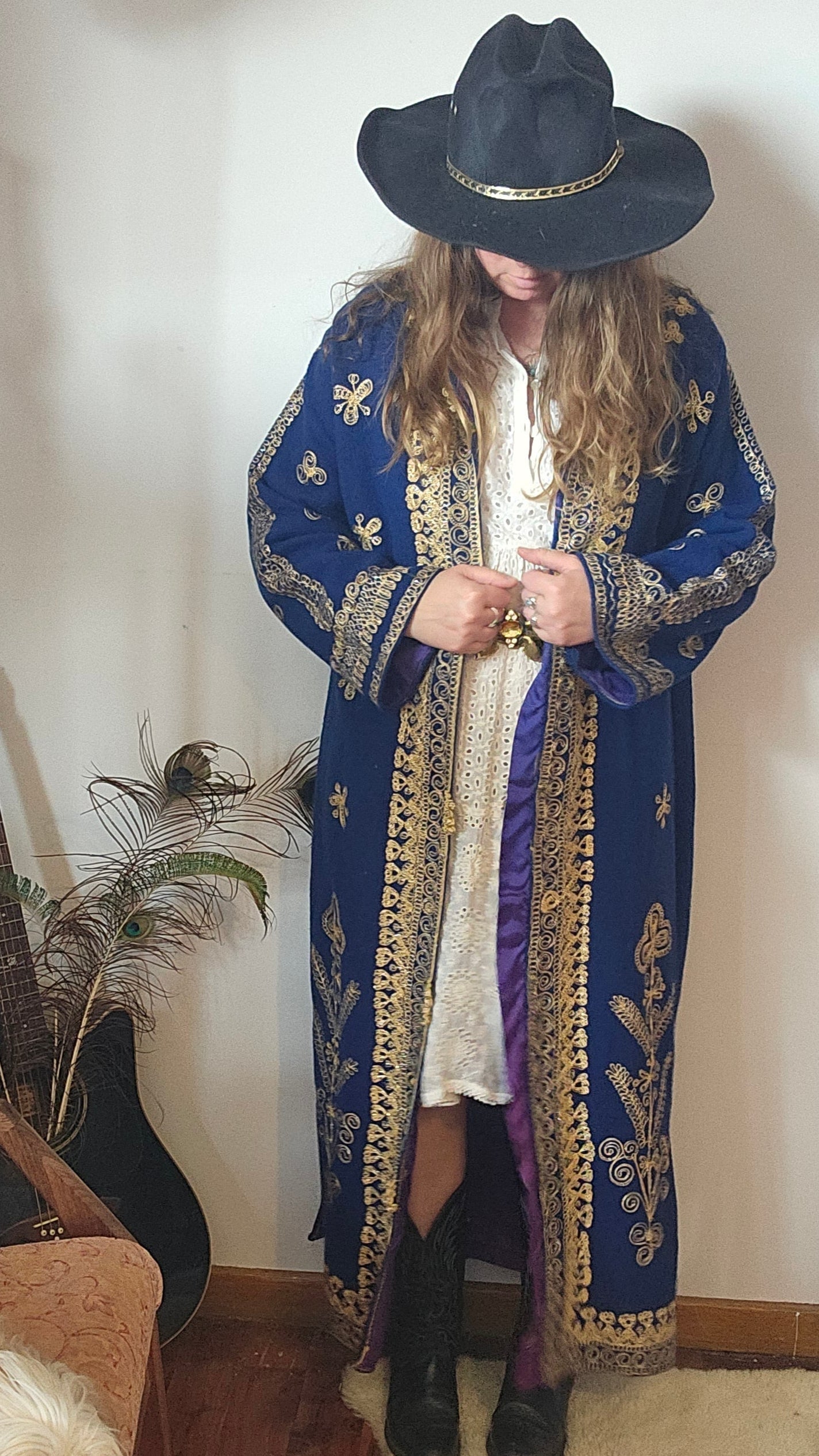 This isn’t just a coat—it’s a statement. With rich royal blue fabric and opulent gold embroidery, this vintage robe is steeped in dramatic charm and boho regality. Fully lined in satin purple with ornate detailing throughout, it’s perfect for festivals, photoshoots, or that one piece that turns heads the moment you walk in.