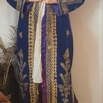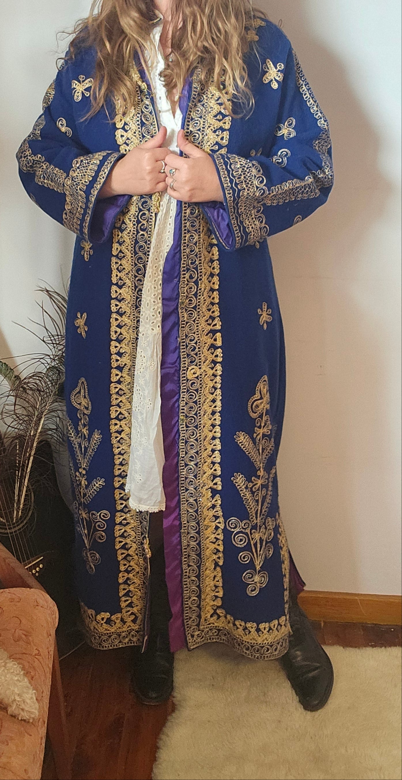 • Details: Intricate gold embroidery, purple satin lining, structured shoulders, boho fantasy vibes