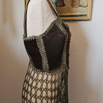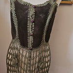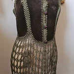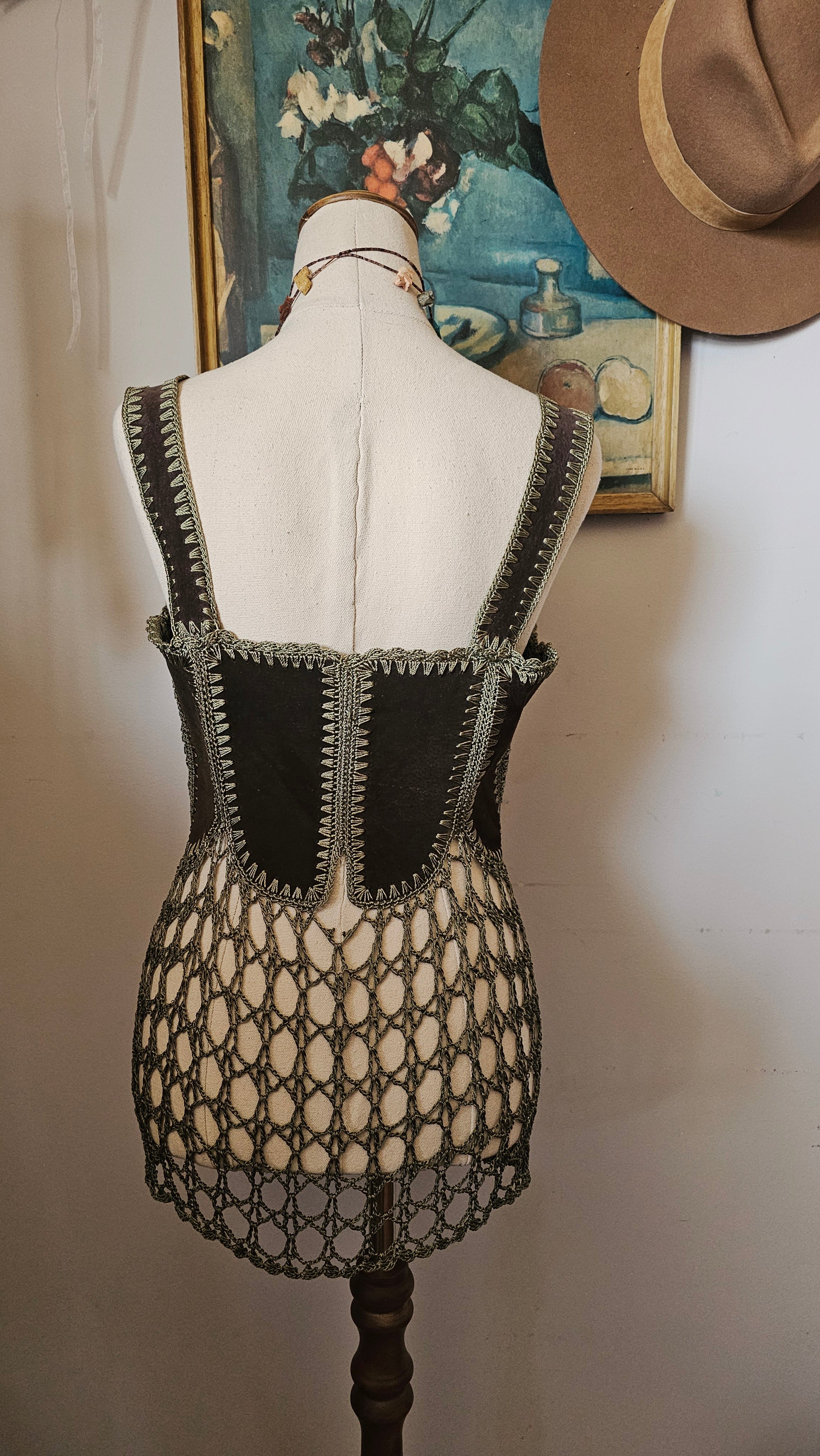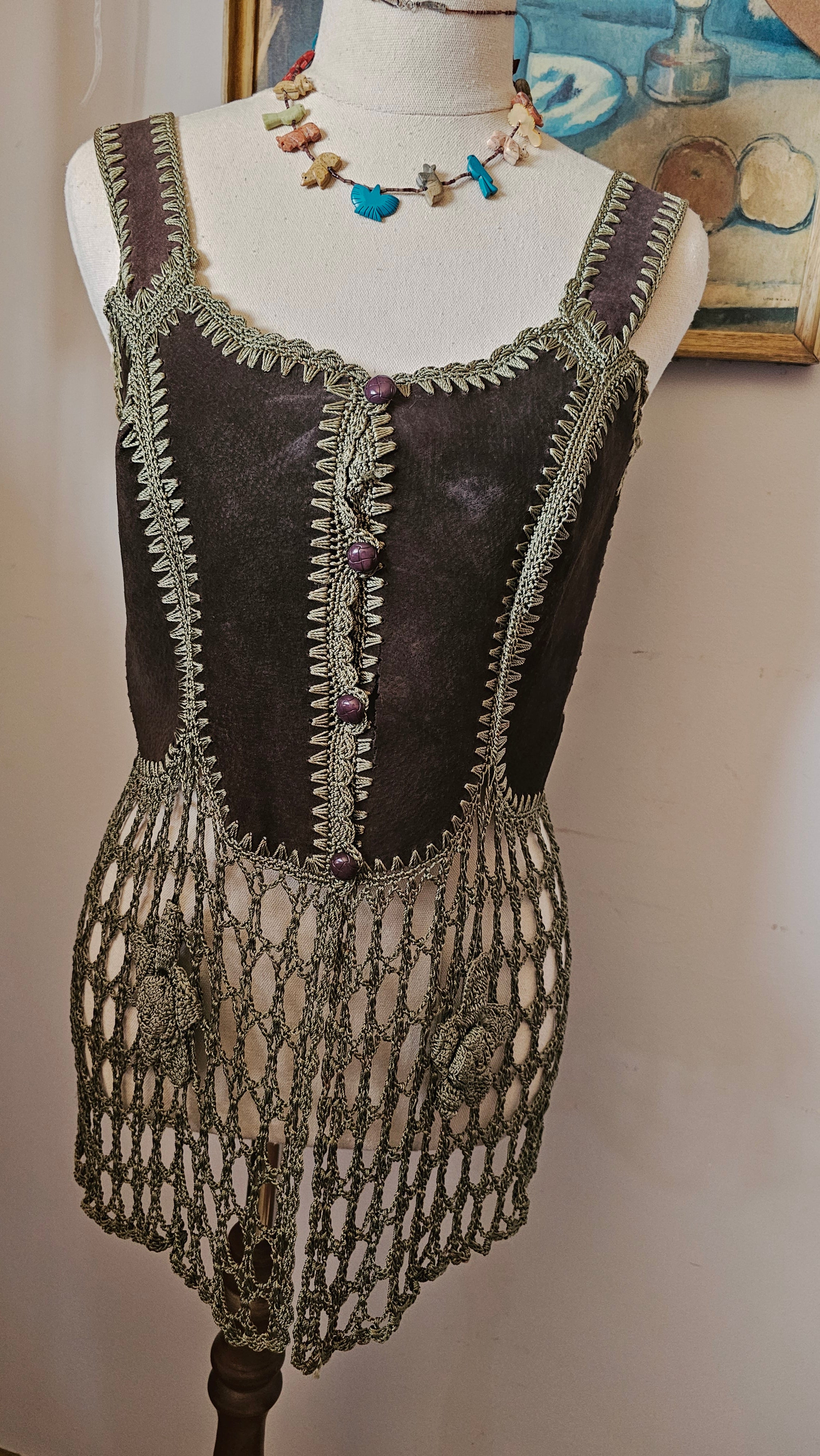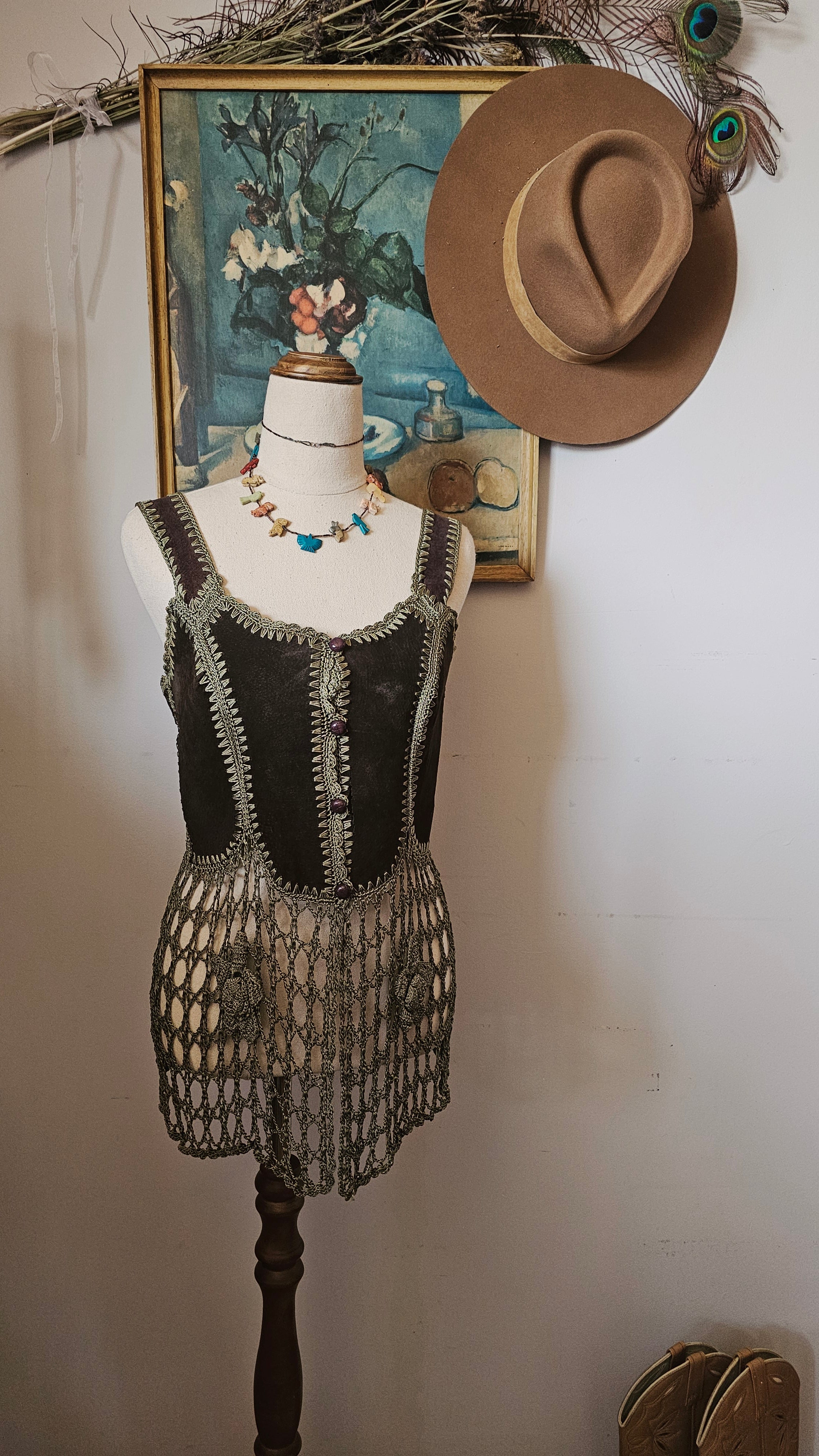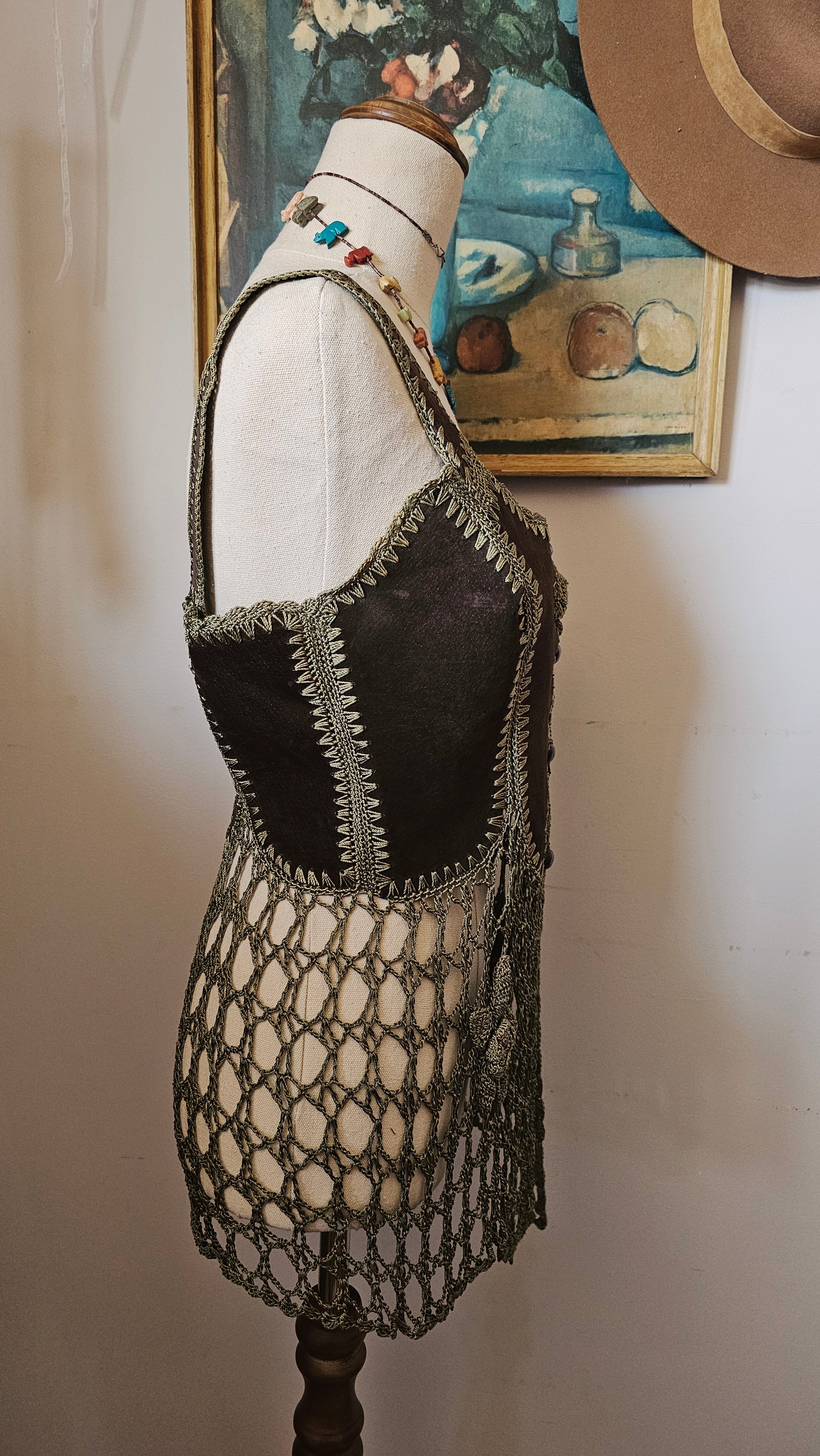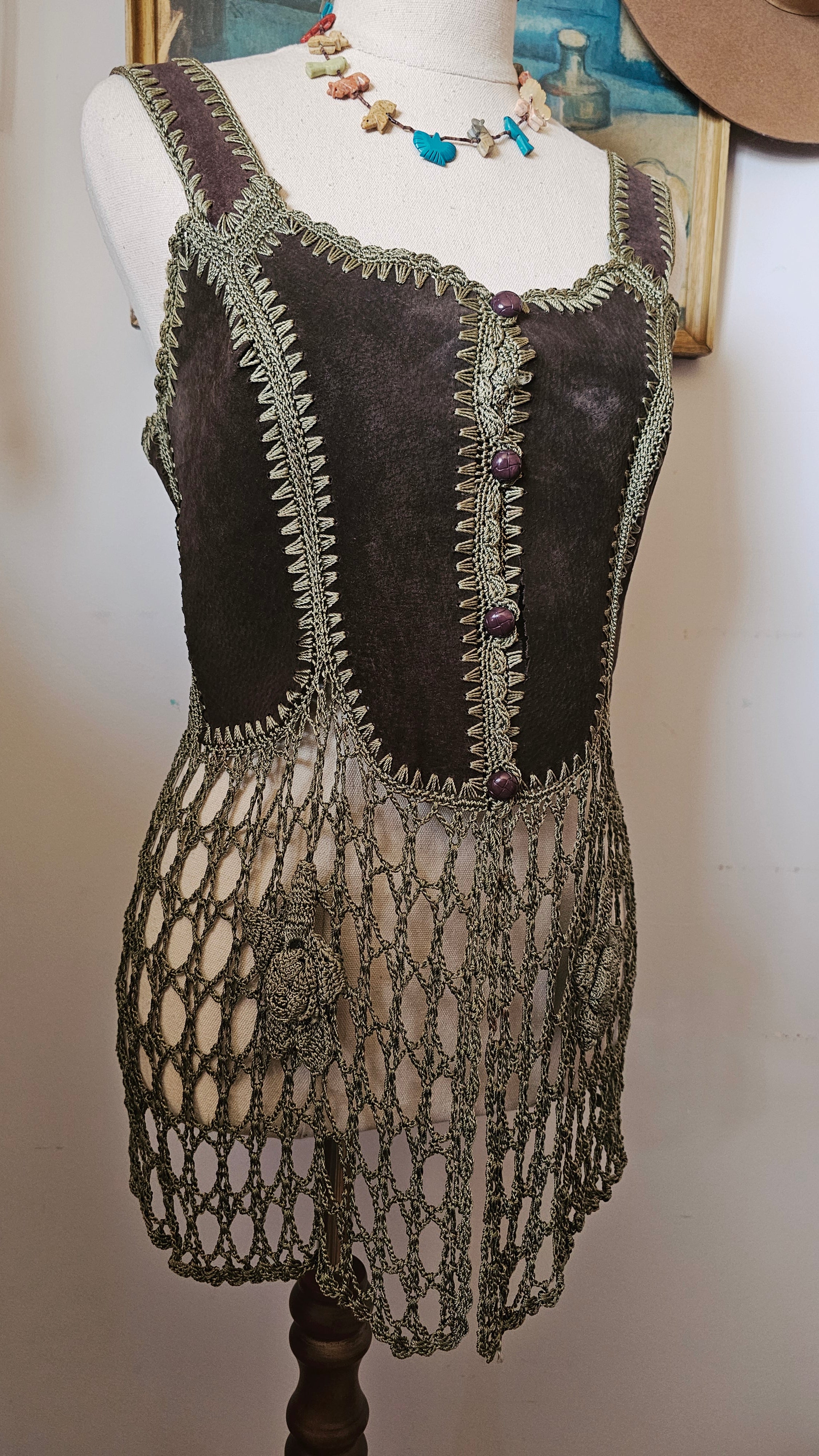 A rare and striking vintage piece blending earthy textures with artisan detail. The bodice is crafted from soft dark suede with hand-stitched edging and decorative buttons down the front, while the skirt is an open crochet weave that gives a bohemian, festival-ready feel. Wide straps and a fitted waist create a flattering silhouette that contrasts with the free-flowing crochet.