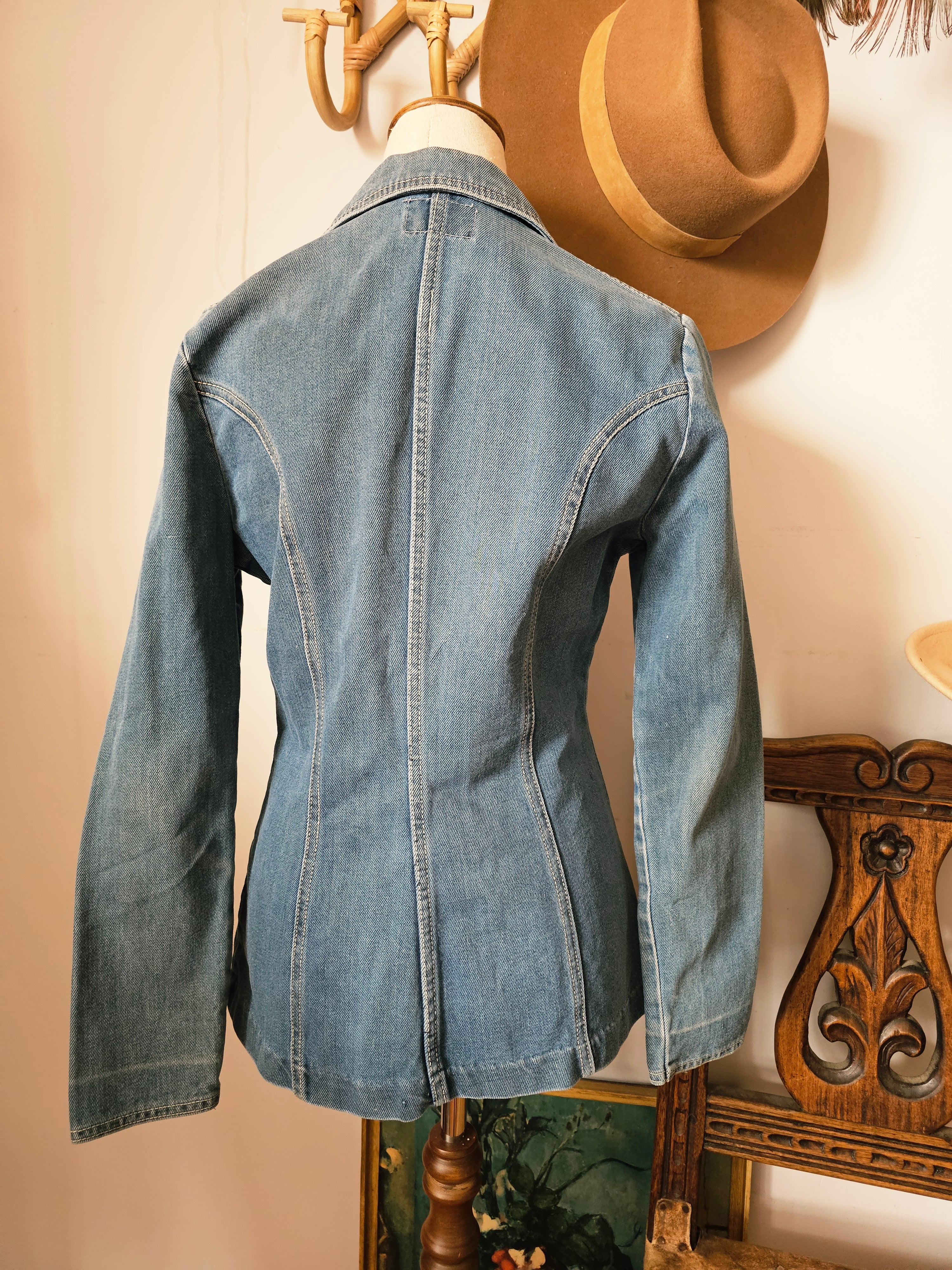 A true 70s classic by Blue Union, this vintage denim jacket brings timeless retro style with its tailored cut and wide collar. Featuring flattering seam details and a fitted silhouette, it’s a piece that easily transitions from casual daywear to evening edge.