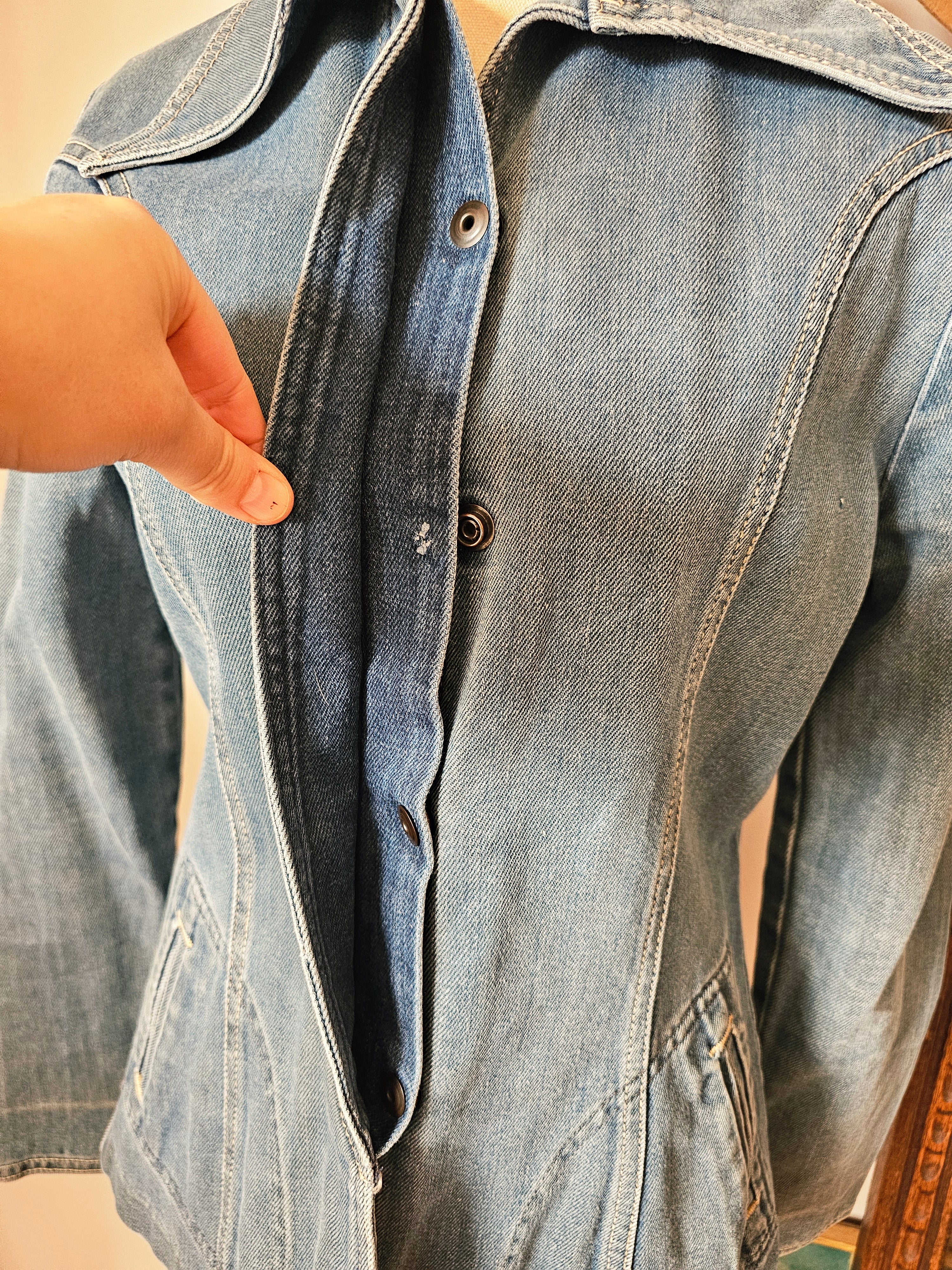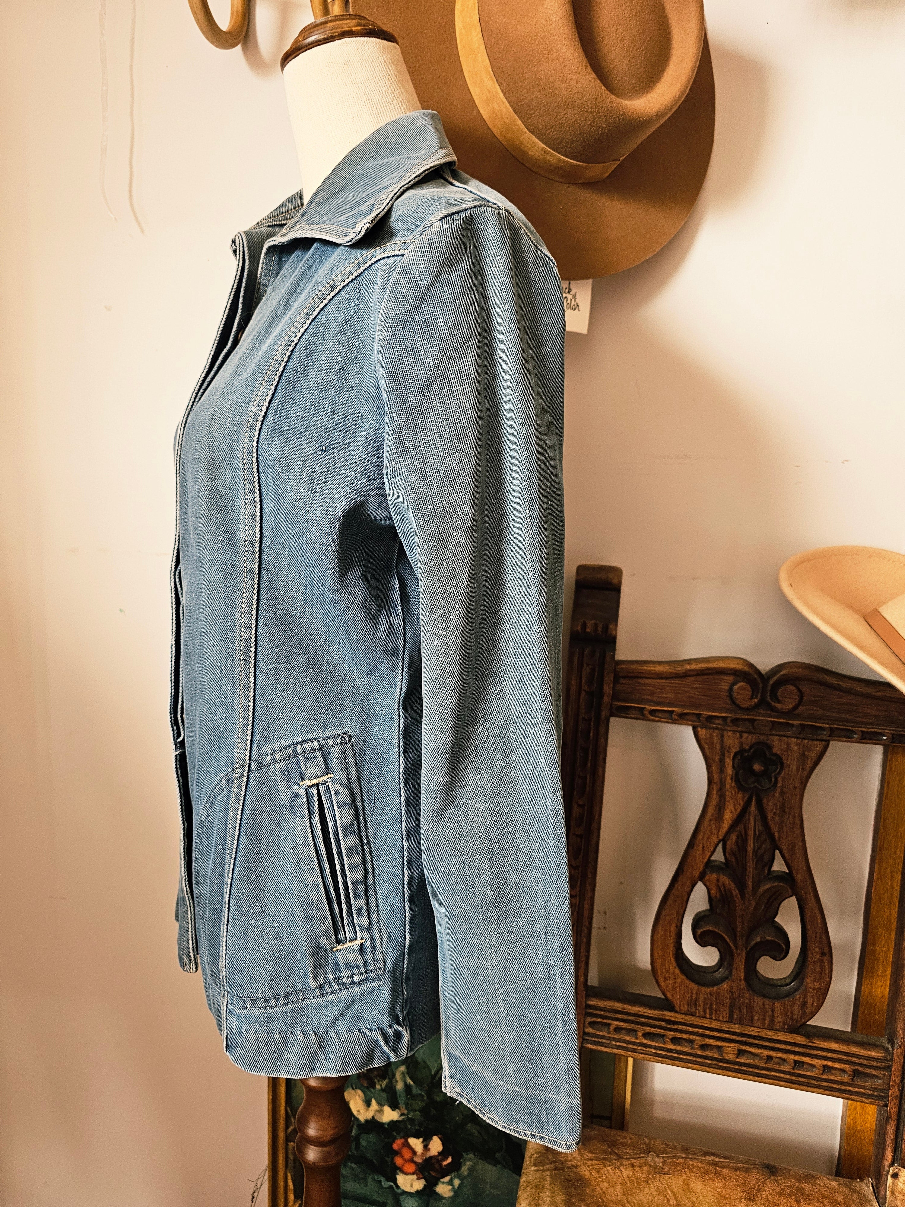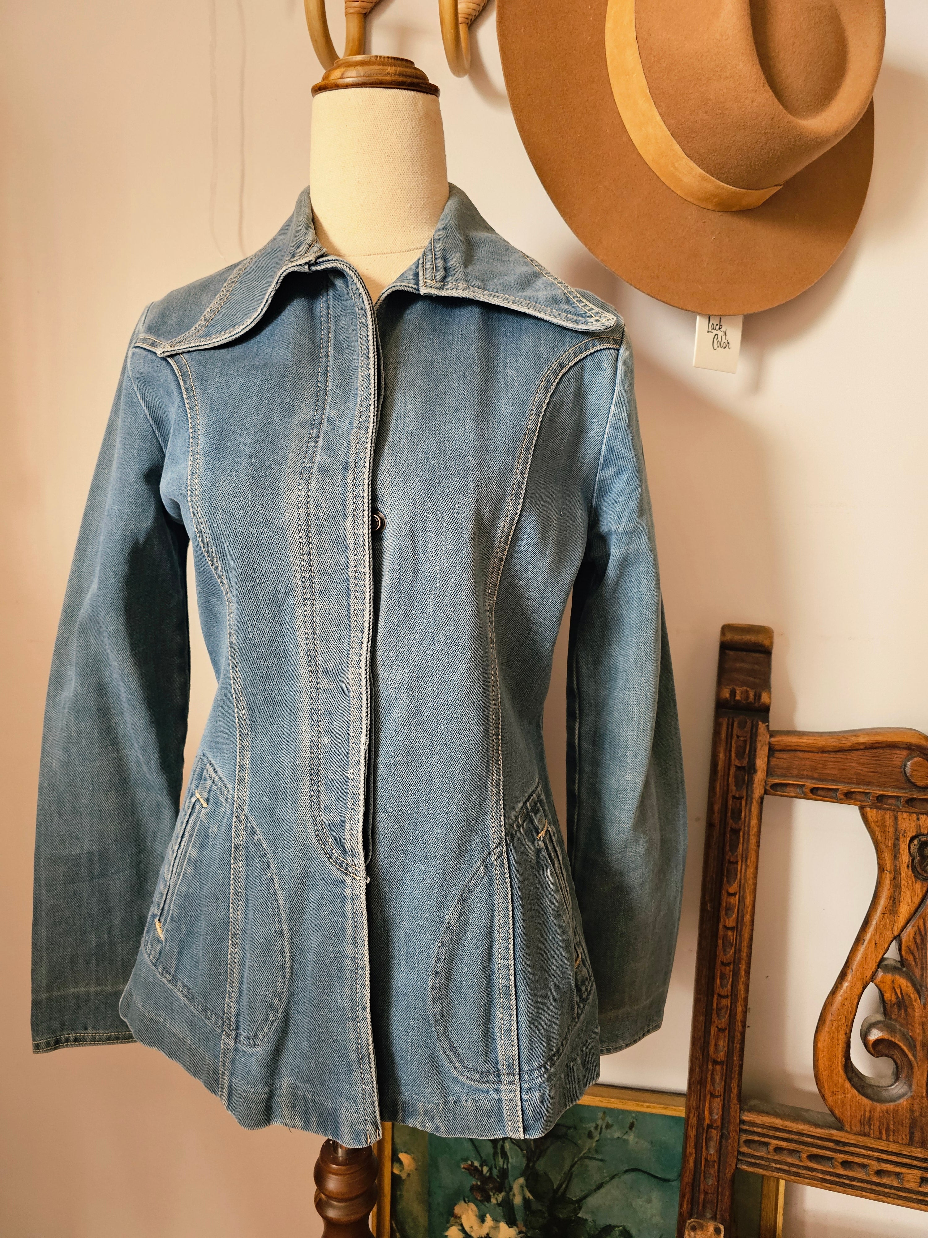 A collectible vintage denim jacket with authentic wear and character, perfect for layering or styling with your favourite flares.