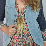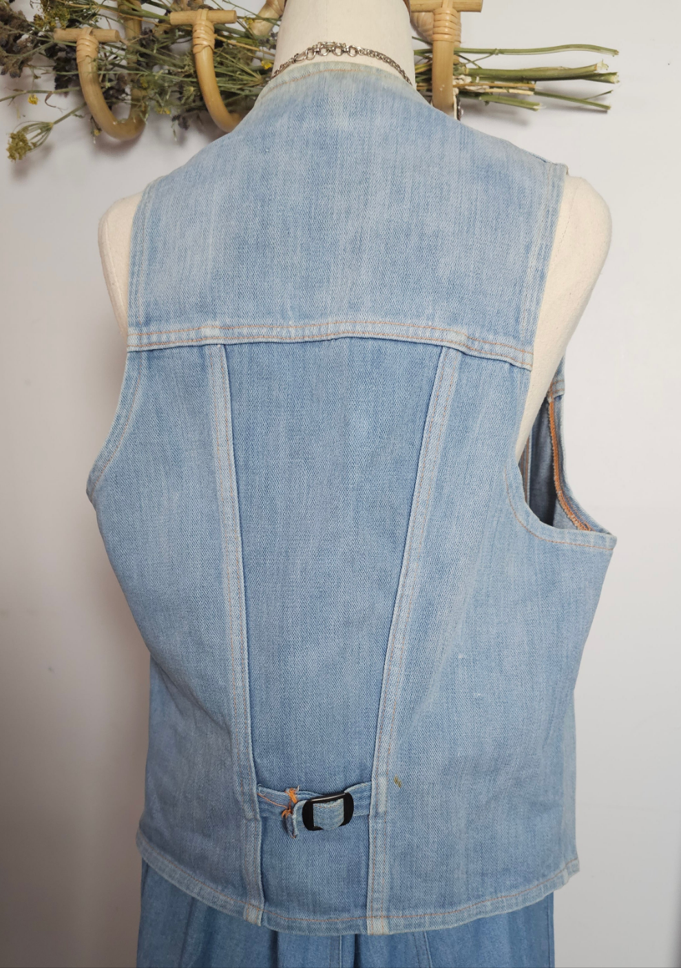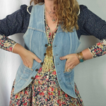Classic and effortlessly cool, this vintage 1970s denim vest is a timeless wardrobe staple. Featuring a button-up front, pointed hem, and adjustable back tabs for the perfect fit, it’s ideal for layering over dresses or pairing with denim for a double-denim look.