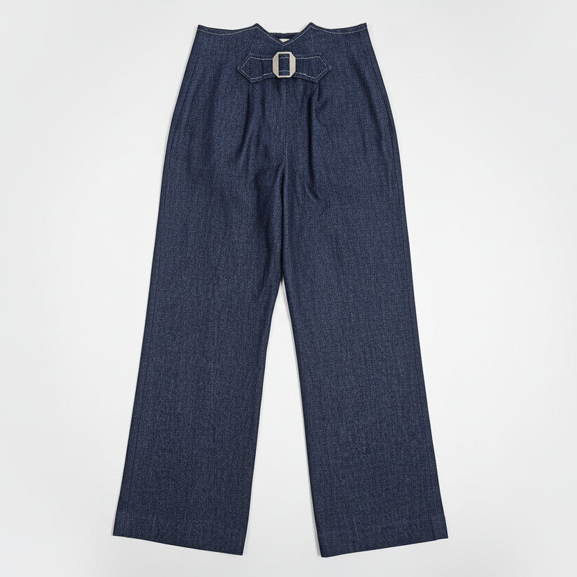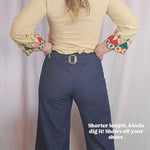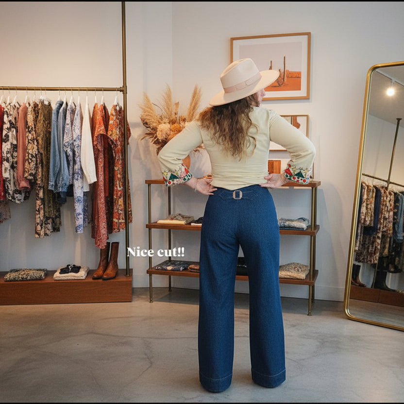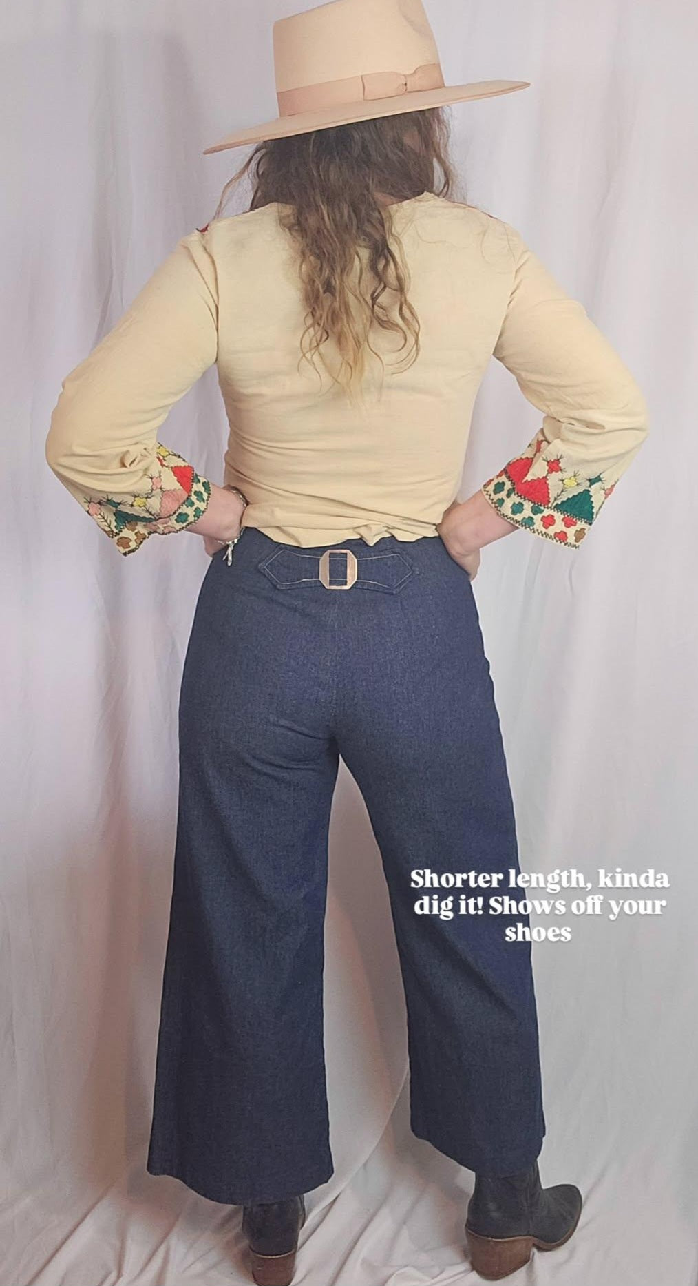 Total western dream. High-rise dark wash denim trousers with a fab wide-leg cut and that stitched buckle back detail that gives real vintage charm. Shorter length that hits just right – perfect for showing off your boots or platforms.
