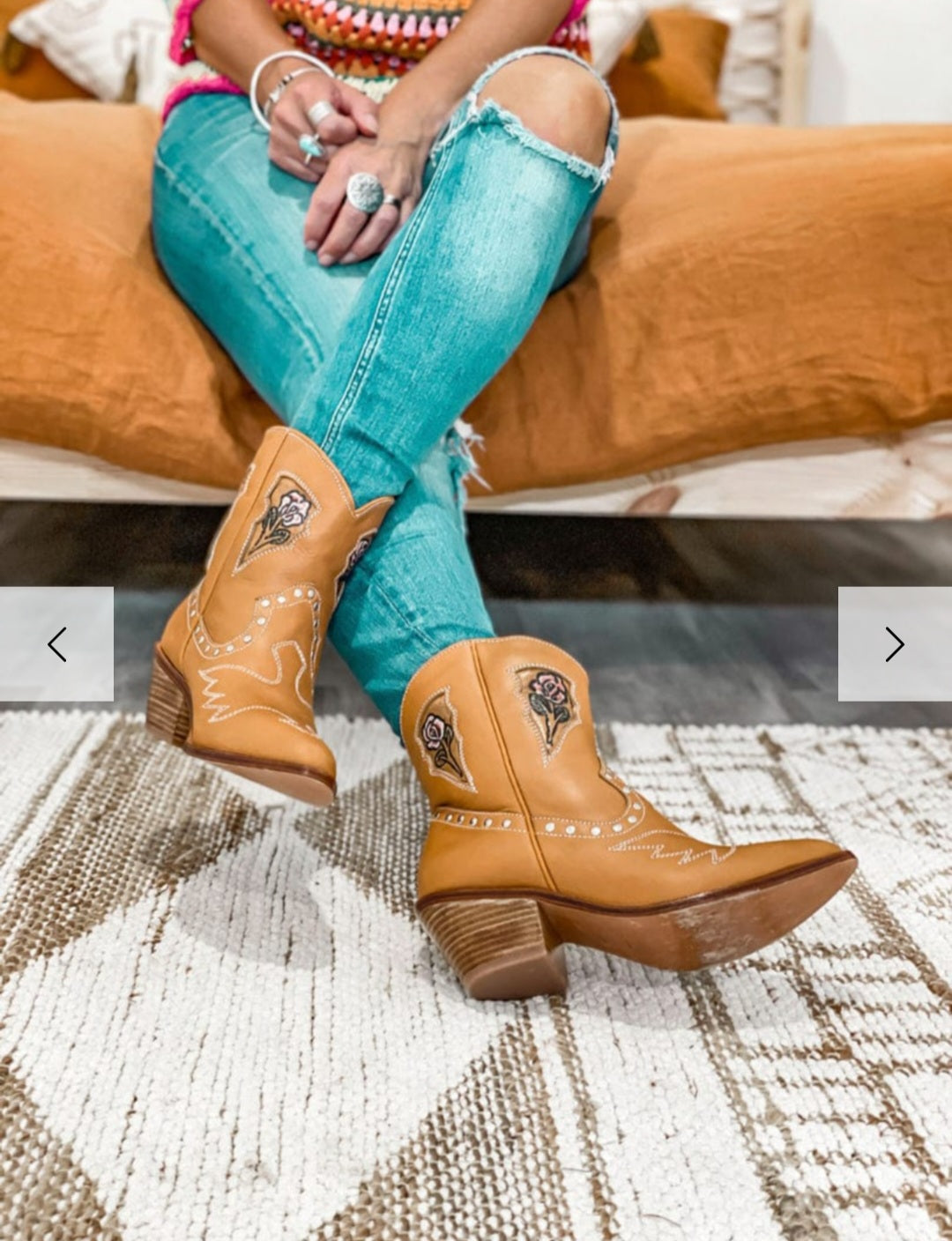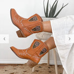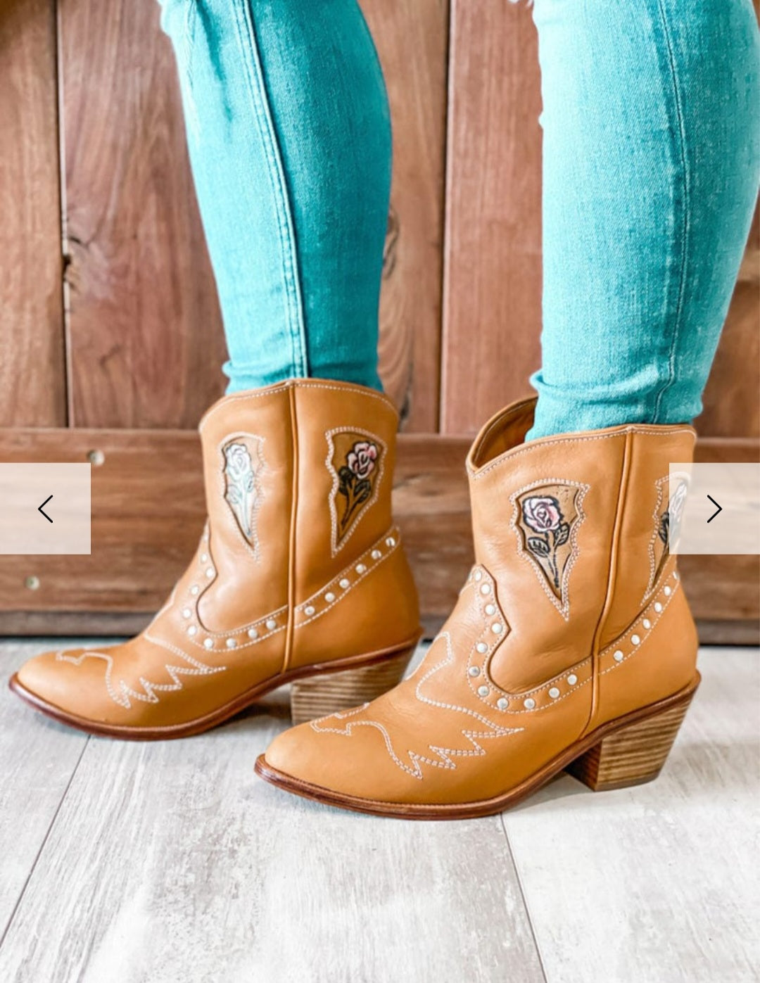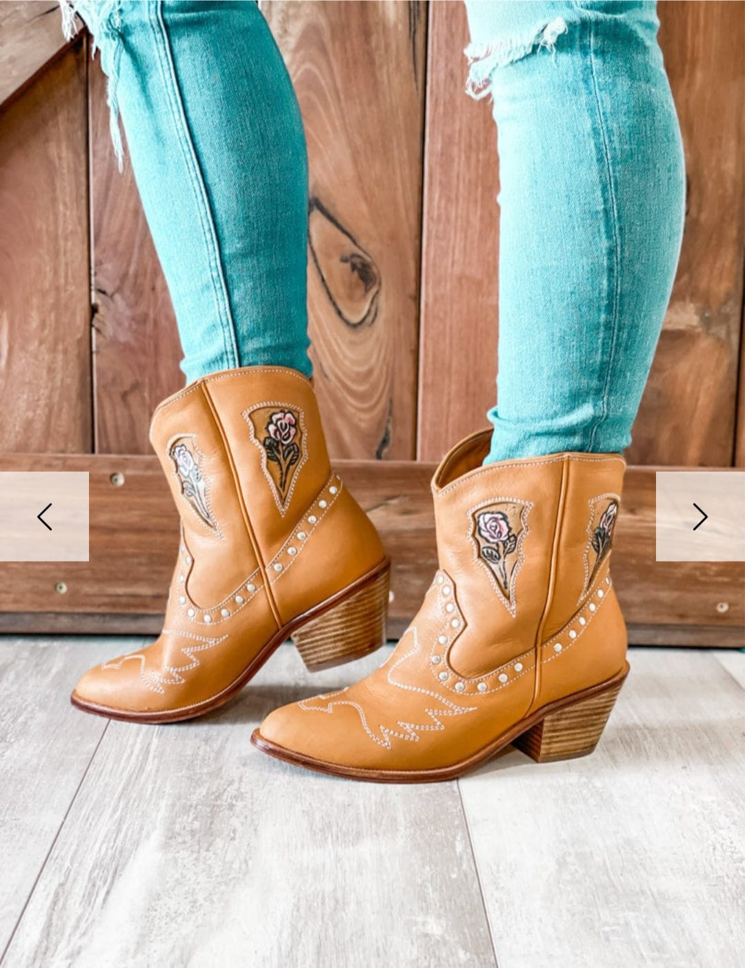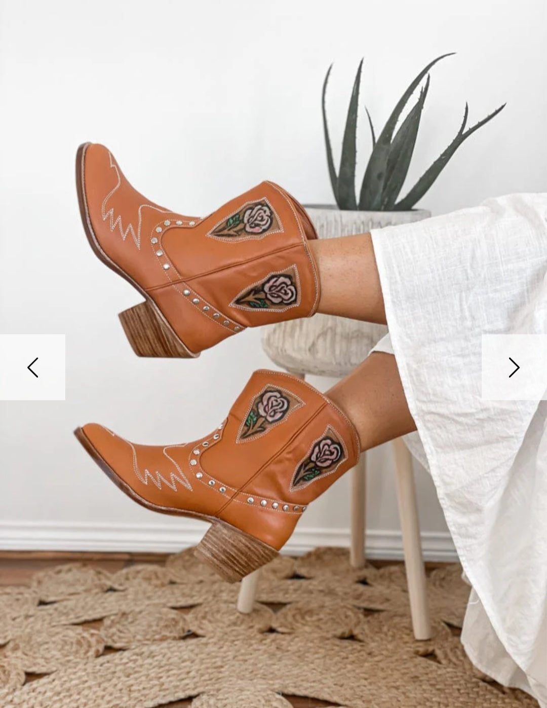 Step into western soul with our Bianca Cowgirl Boots. Crafted from genuine leather, these boots feature hand-painted rose inlays, studded accents, and intricate stitchwork that make every pair a statement. With a comfortable stacked block heel and pull-on design, they’re built for style and ease.