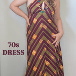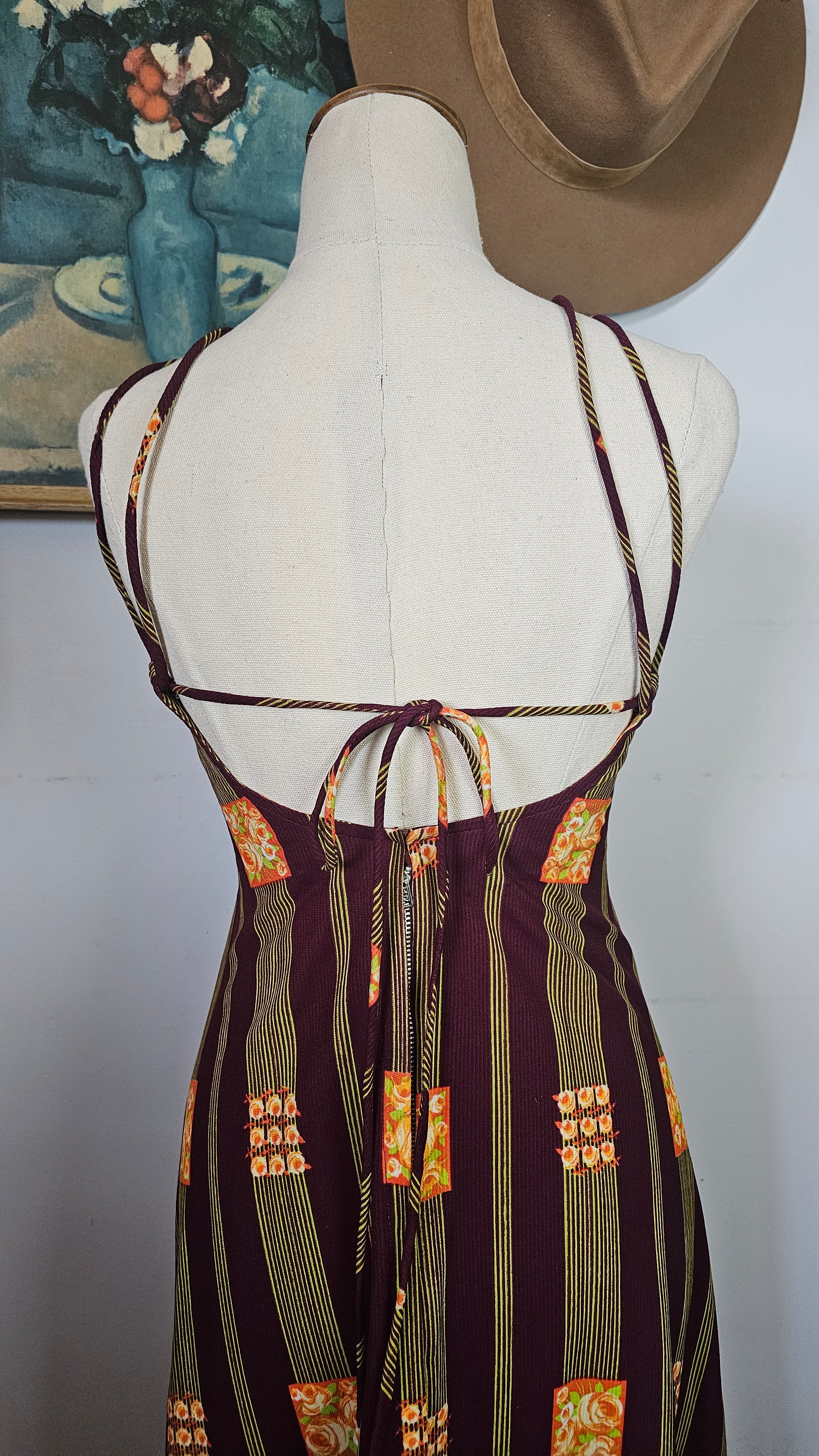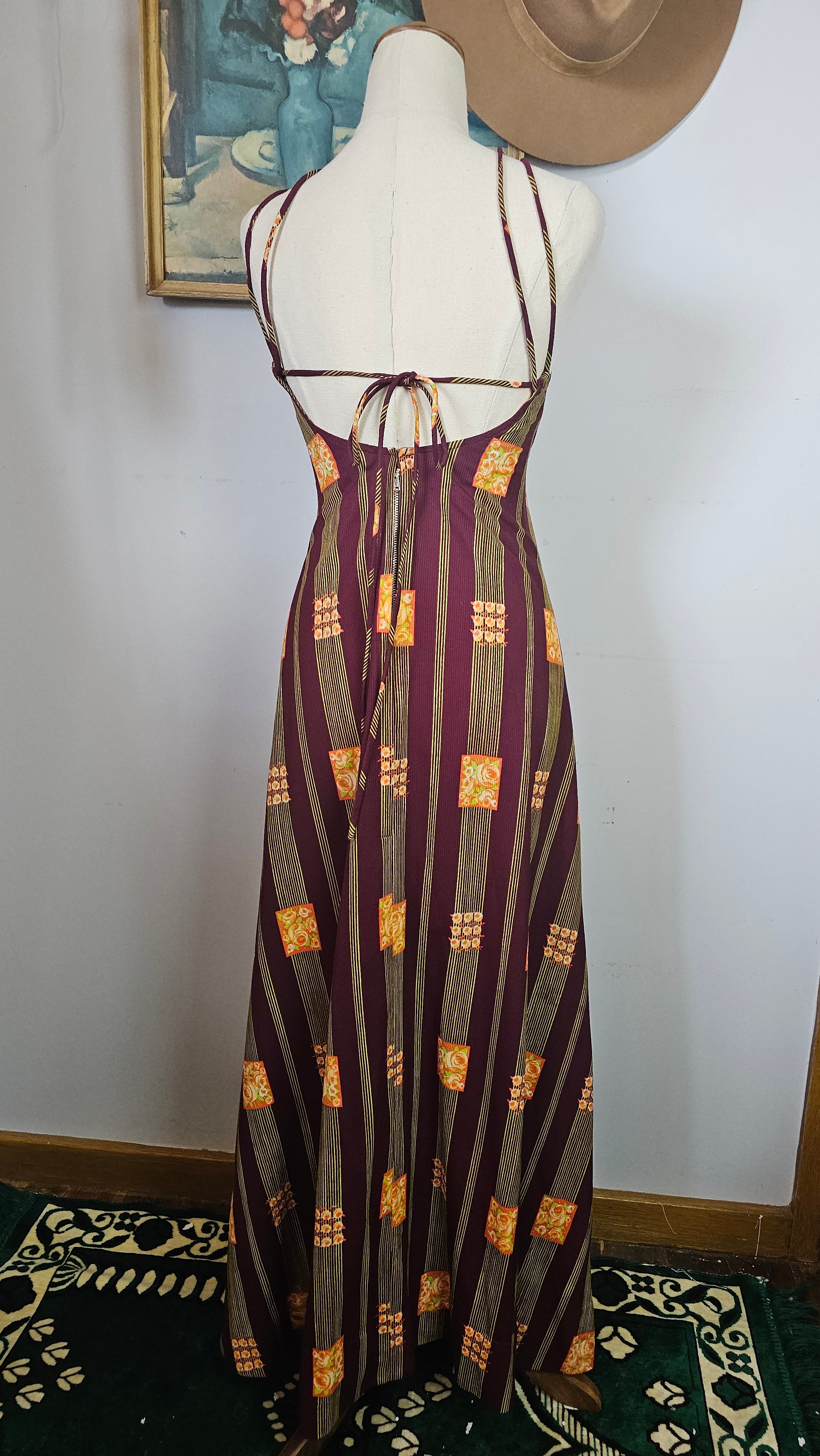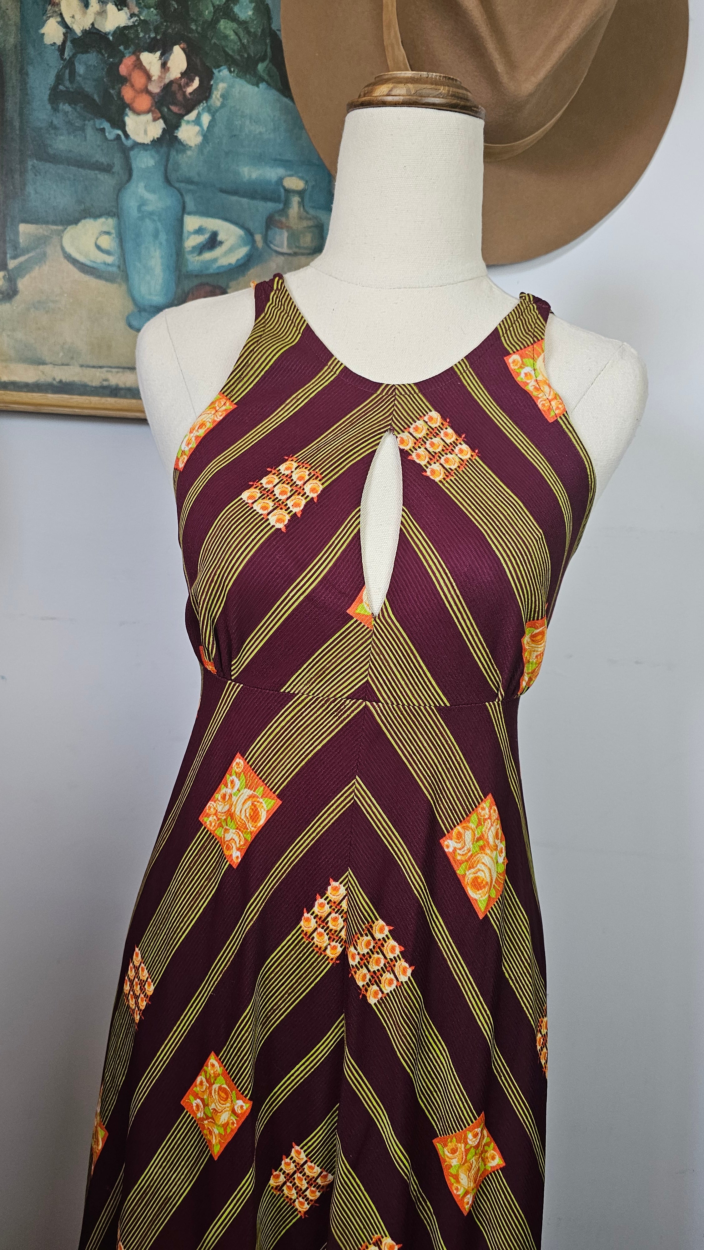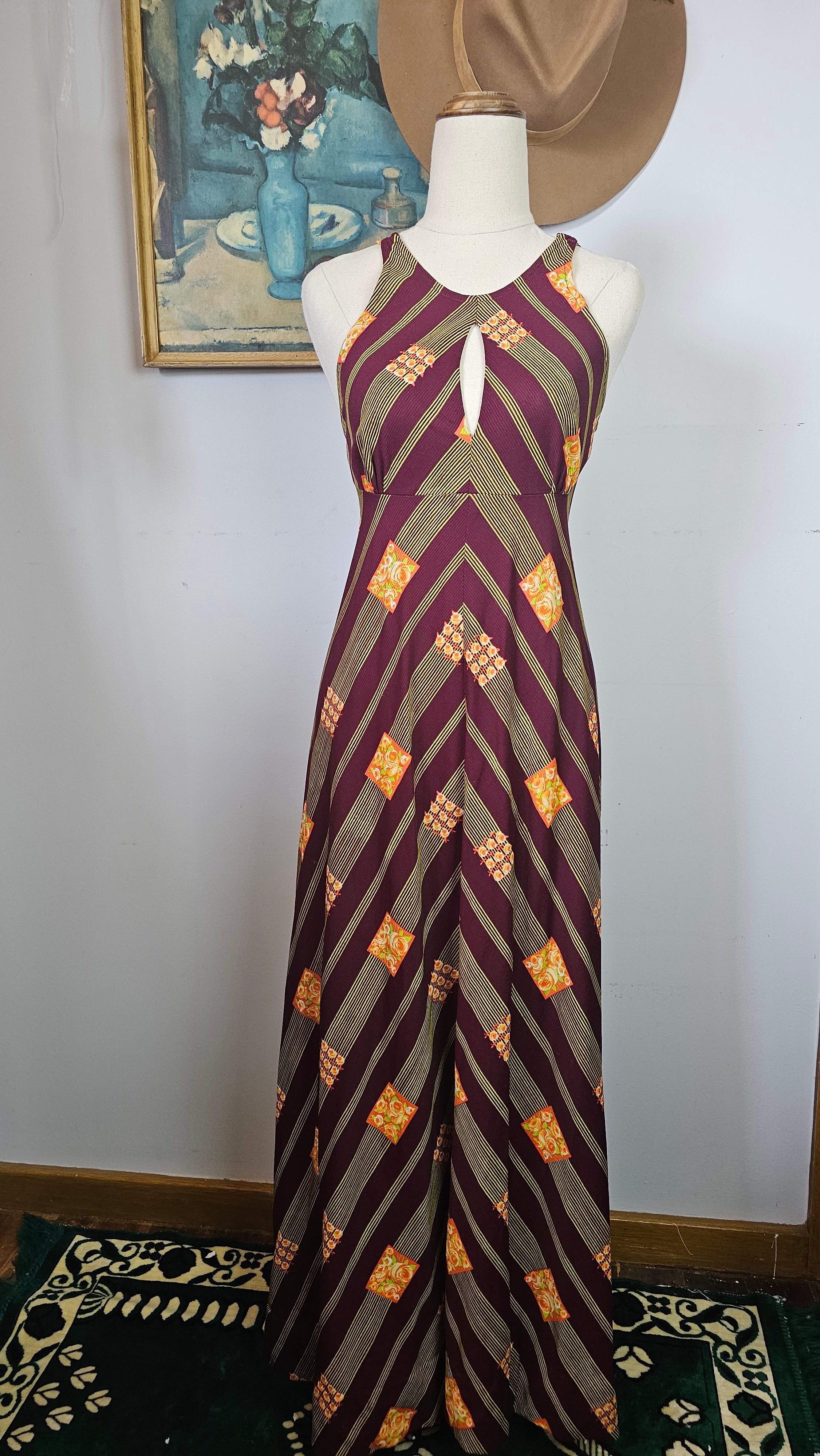True 1970s magic ✨ in rich plum, mustard, and orange chevron stripes. This vintage Lady Bela piece features a halter-style neckline with front keyhole detail, open tie-back design, and a figure-hugging stretch fabric that flatters every curve.
