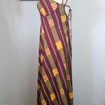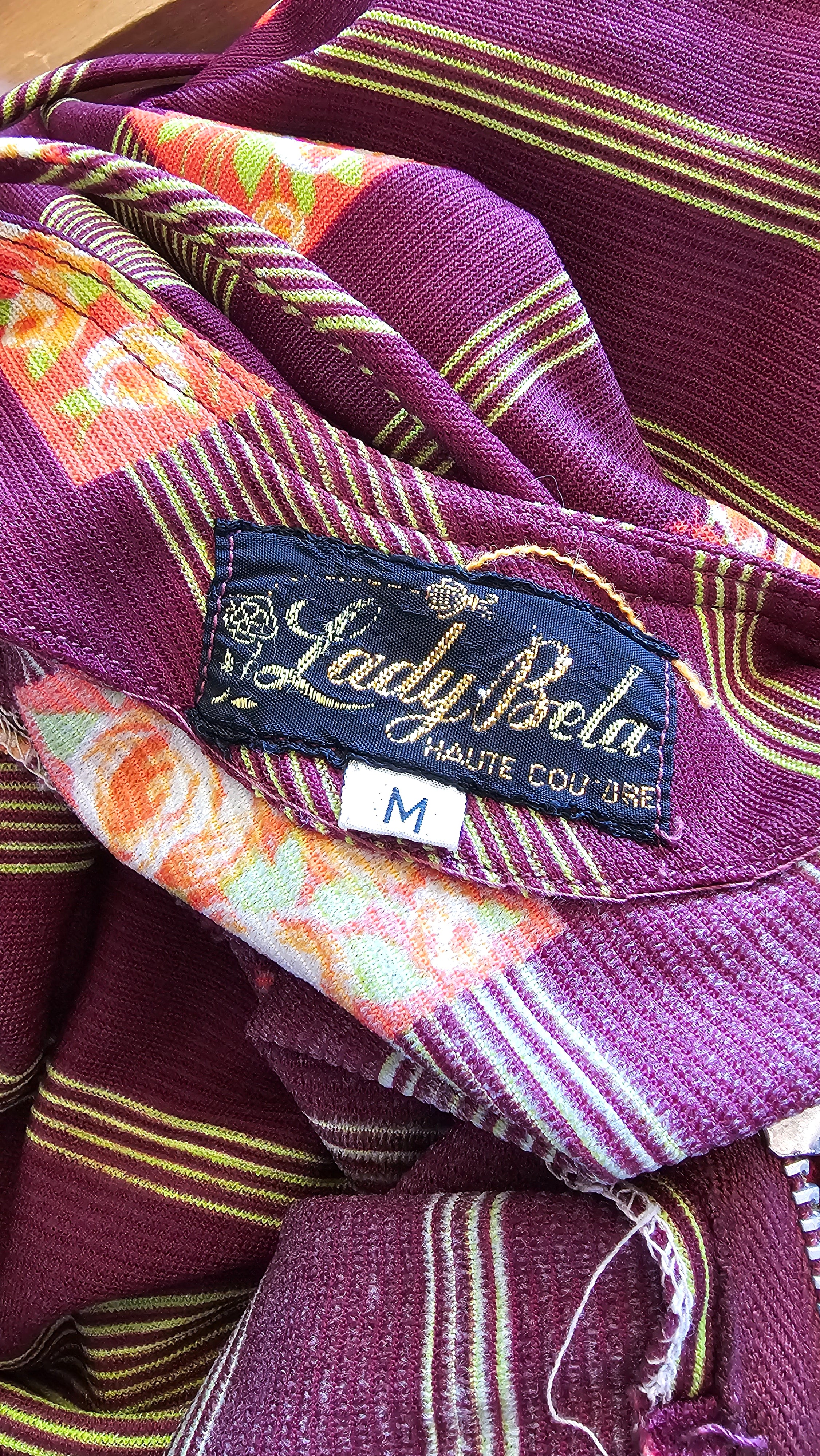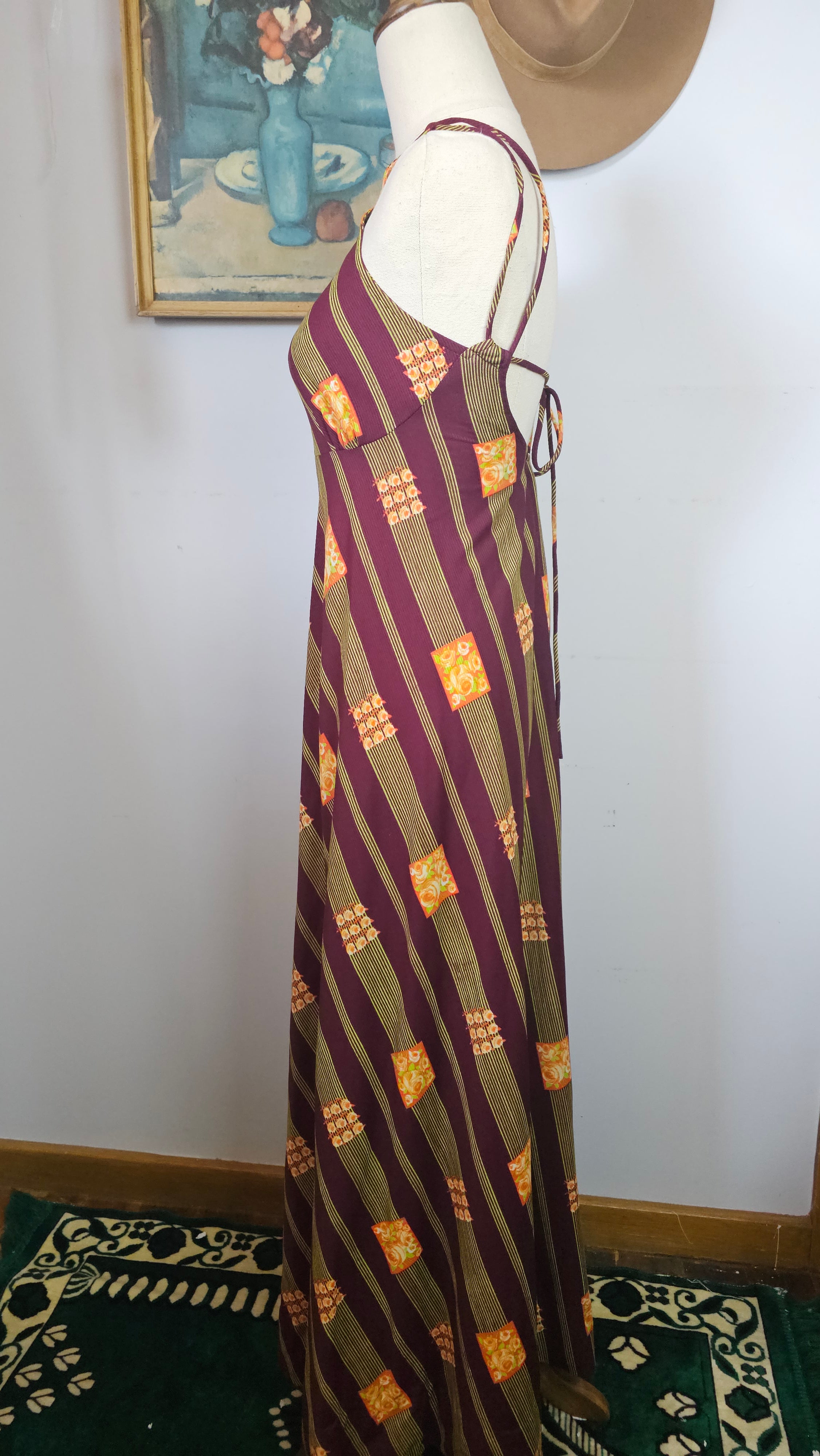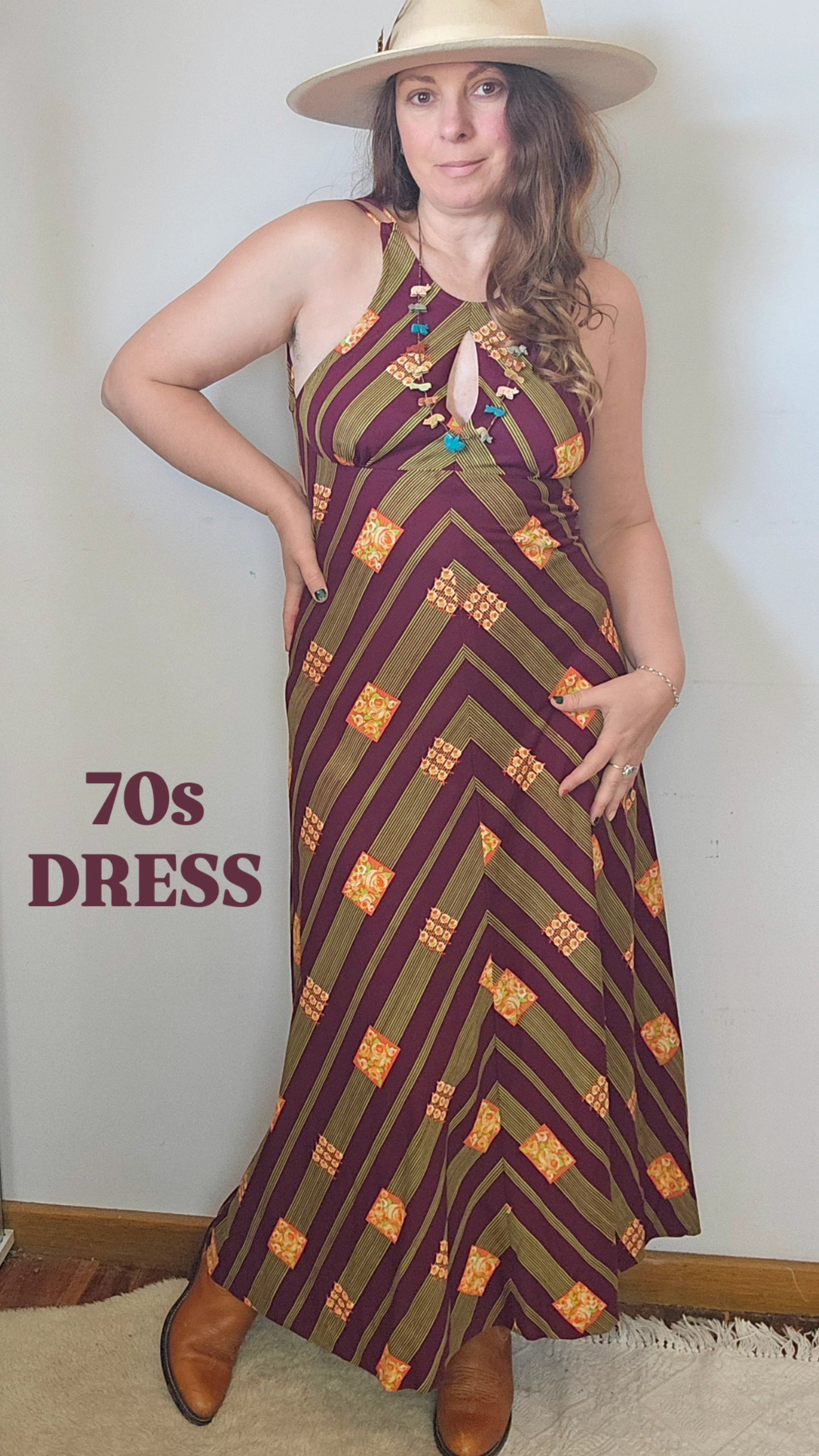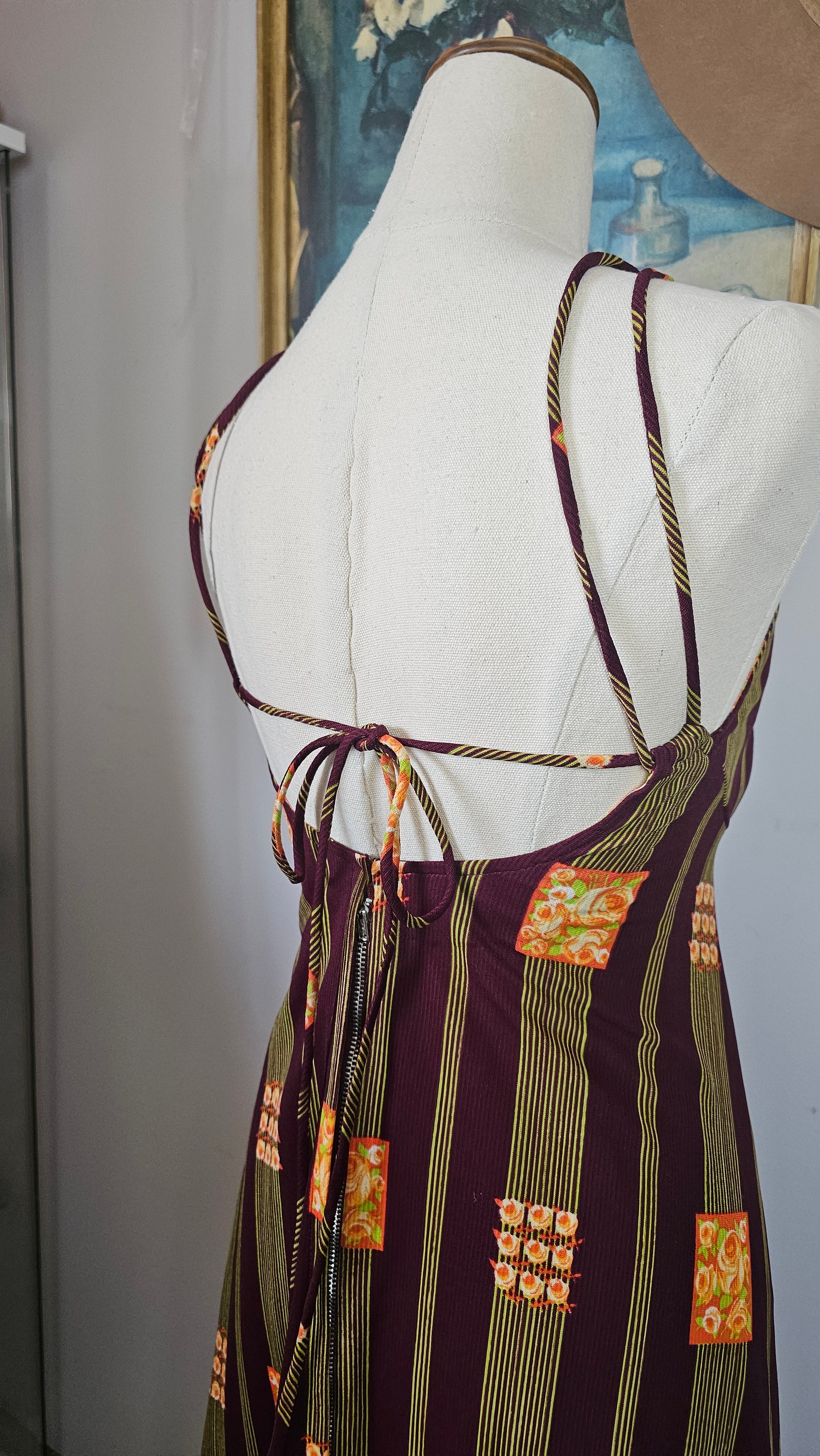 True 1970s magic ✨ in rich plum, mustard, and orange chevron stripes. This vintage Lady Bela piece features a halter-style neckline with front keyhole detail, open tie-back design, and a figure-hugging stretch fabric that flatters every curve.