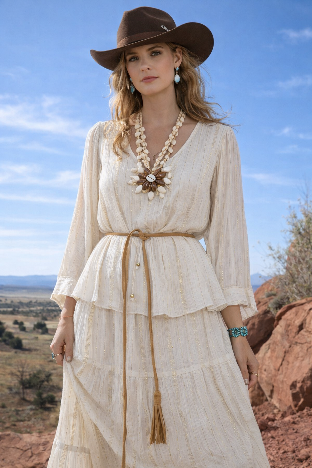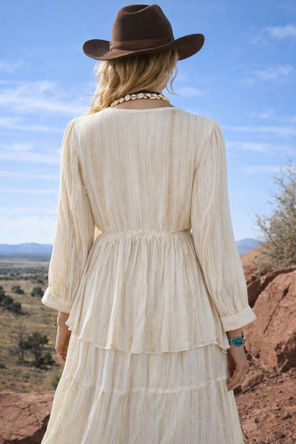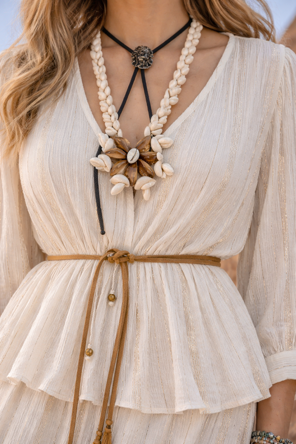 Add a touch of effortless elegance to your wardrobe with this beautiful Auguste Liesel blouse. Designed in a soft ivory tone with shimmering gold thread accents, this blouse is perfect for a bohemian-chic look. Features include:
