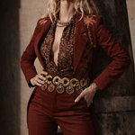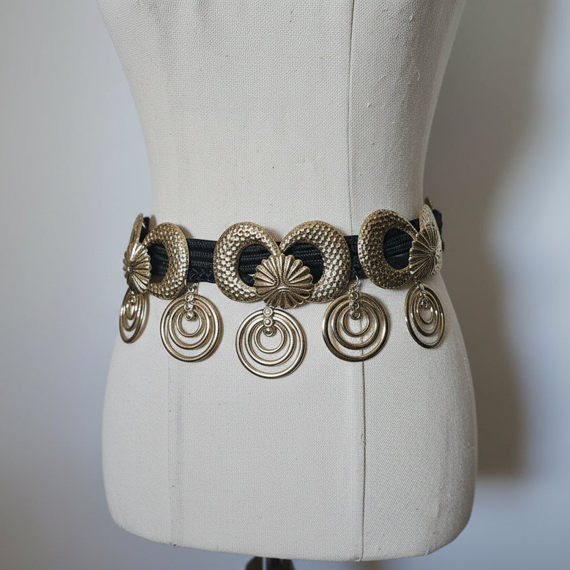 Pure retro drama ✨ — this is the kind of belt that makes the outfit. Rows of hammered gold discs with cascading ring drops give it that unmistakable 80s high-glam, bohemian-meets-disco energy. It moves beautifully when worn and instantly defines the waist over dresses, knits or denim.