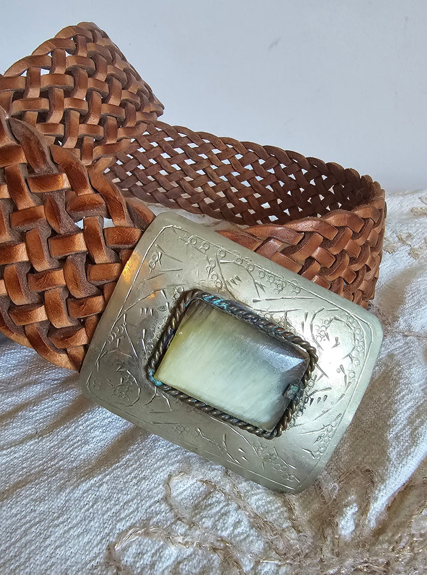 A stunning vintage woven leather belt with a beautiful engraved silver-tone buckle featuring a soft, pearly centre. Gorgeous craftsmanship, thick leather, and a real boho-western statement piece that works with dresses, denim and oversized knits.
