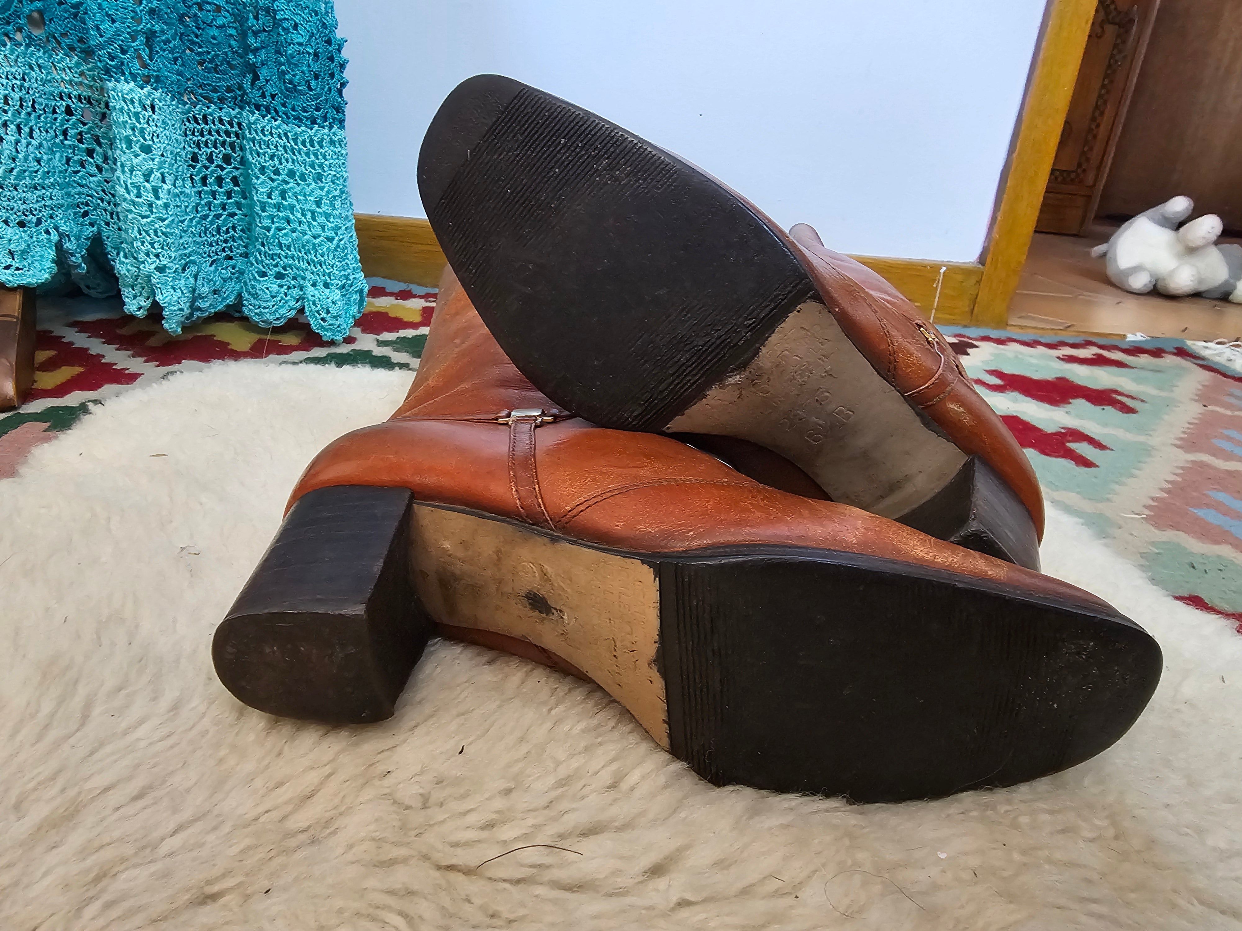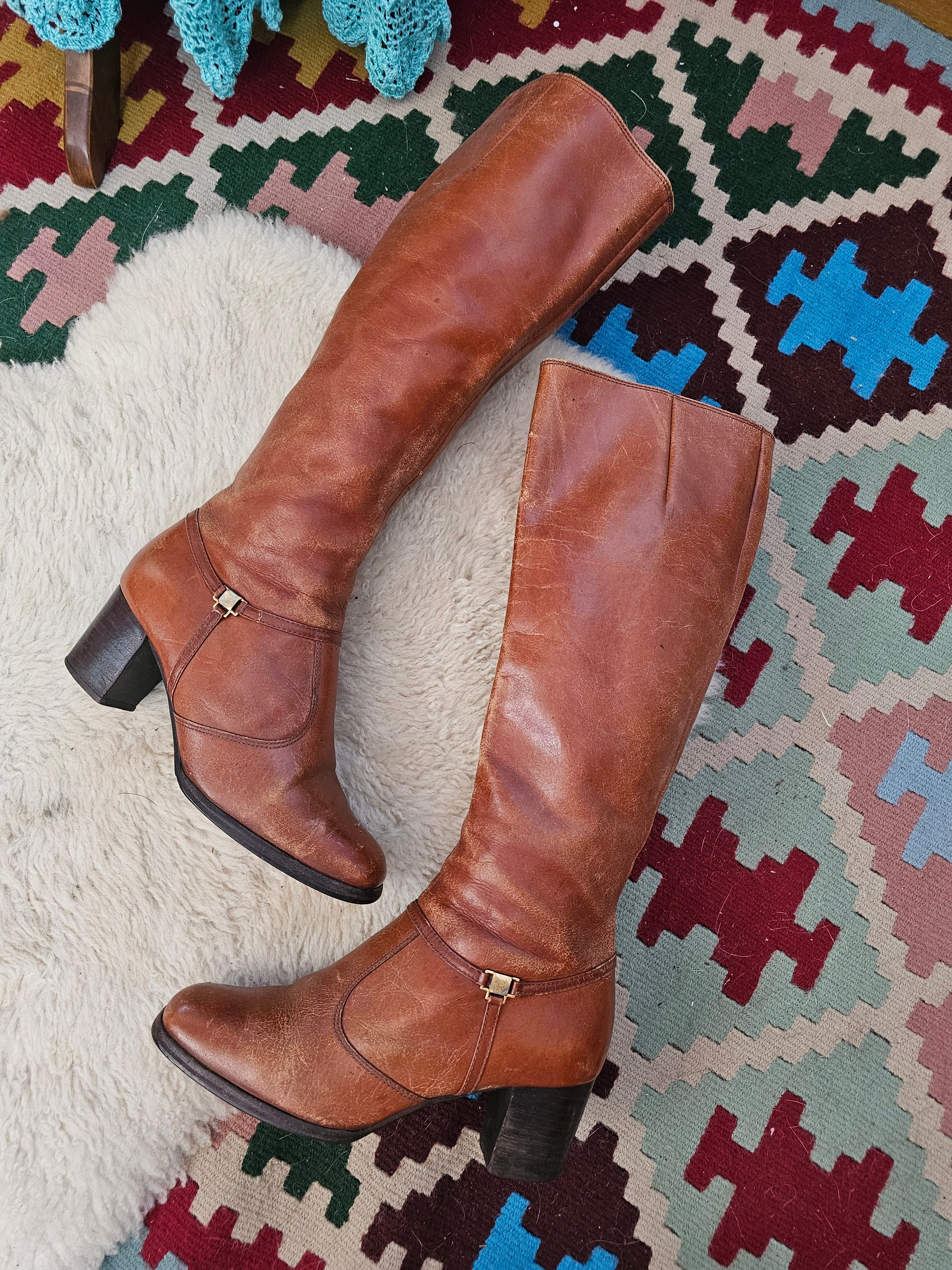True 70s soul in the most incredible lived-in leather. These boots carry that perfectly aged patina only time can create — rich tan tones, natural creasing and a sculpted shape that hugs the leg in all the right places. The stacked heel and high shaft give them that unmistakable vintage silhouette, ready to pair with minis, crochet, denim or flares.