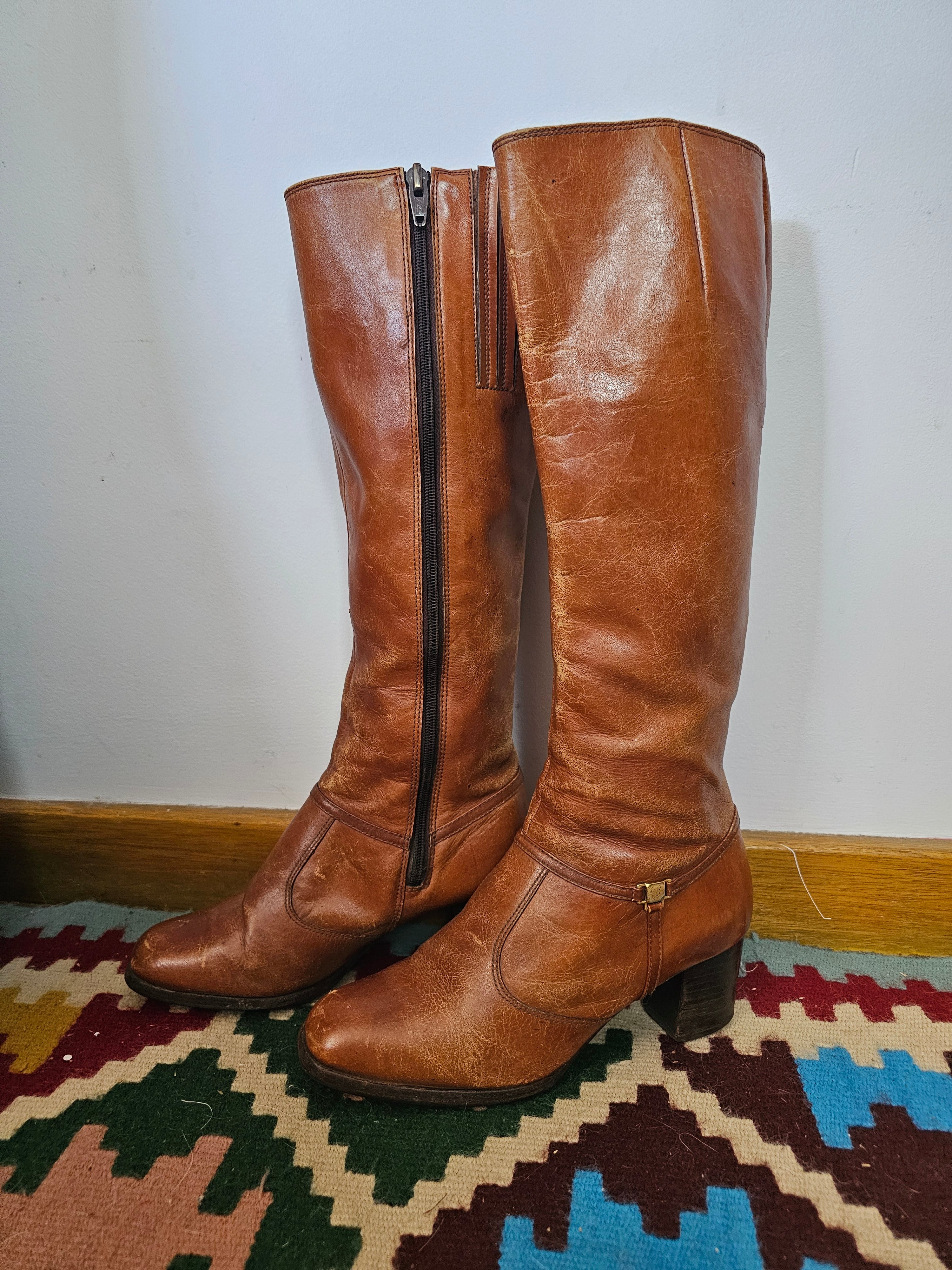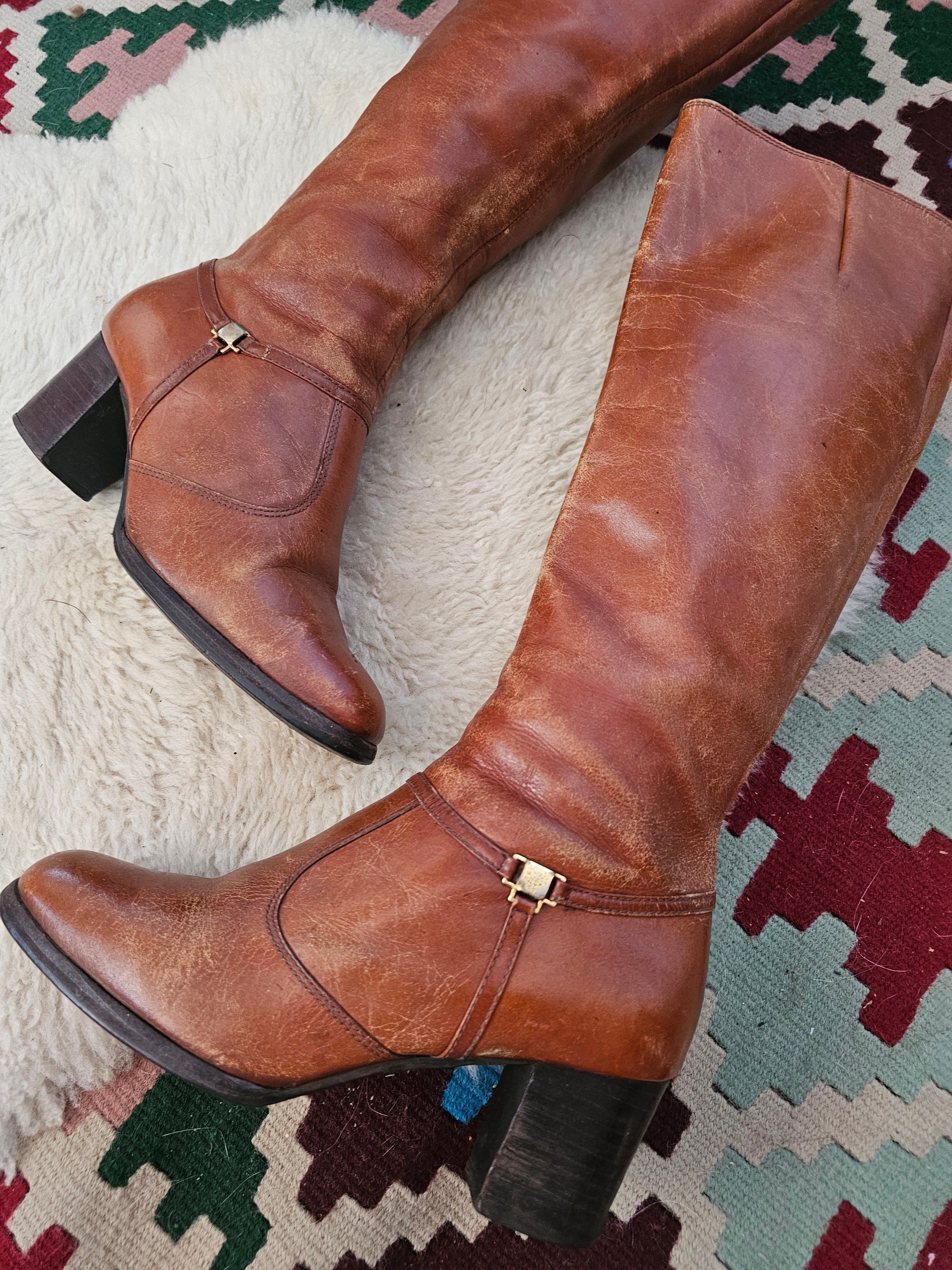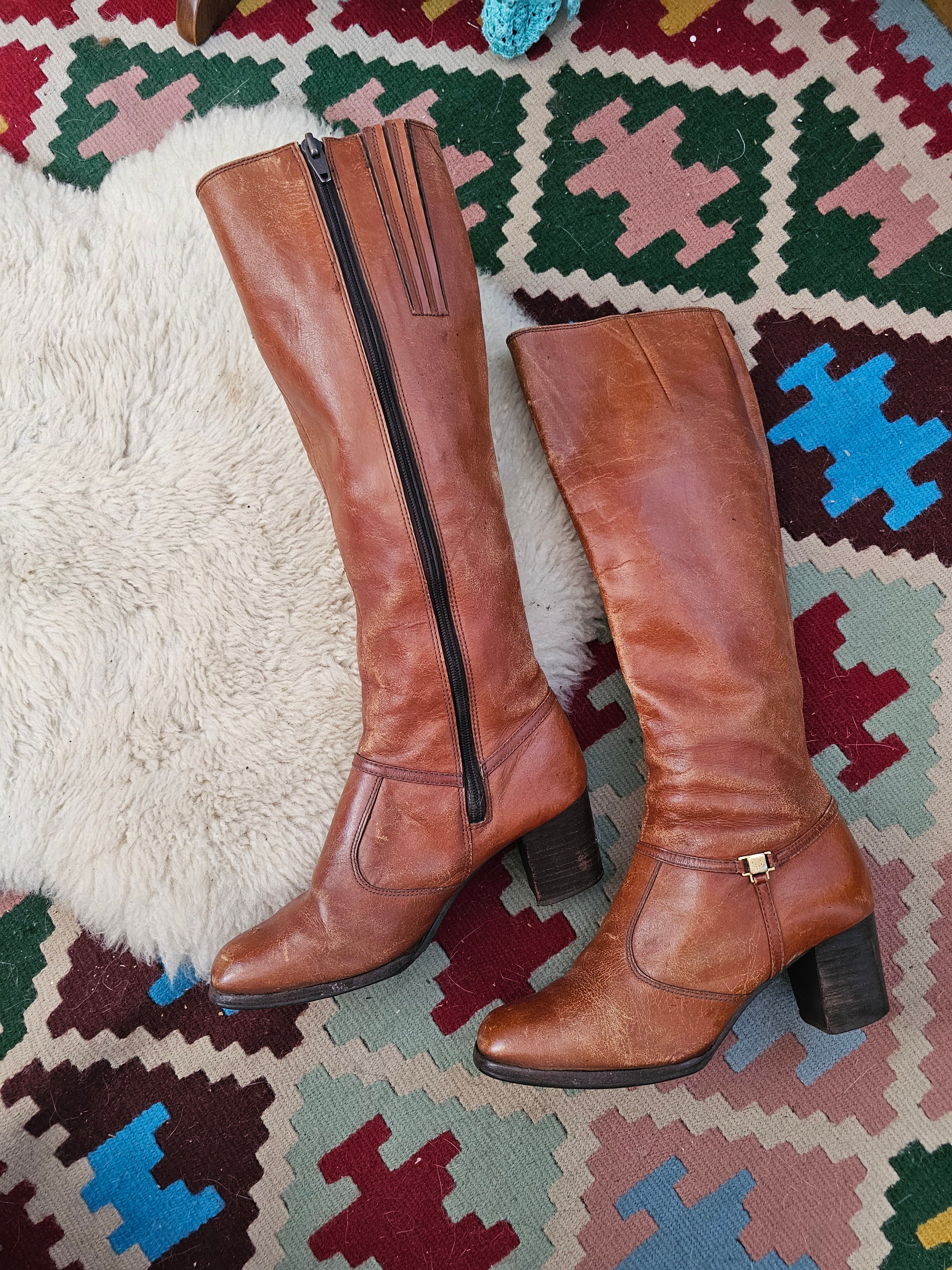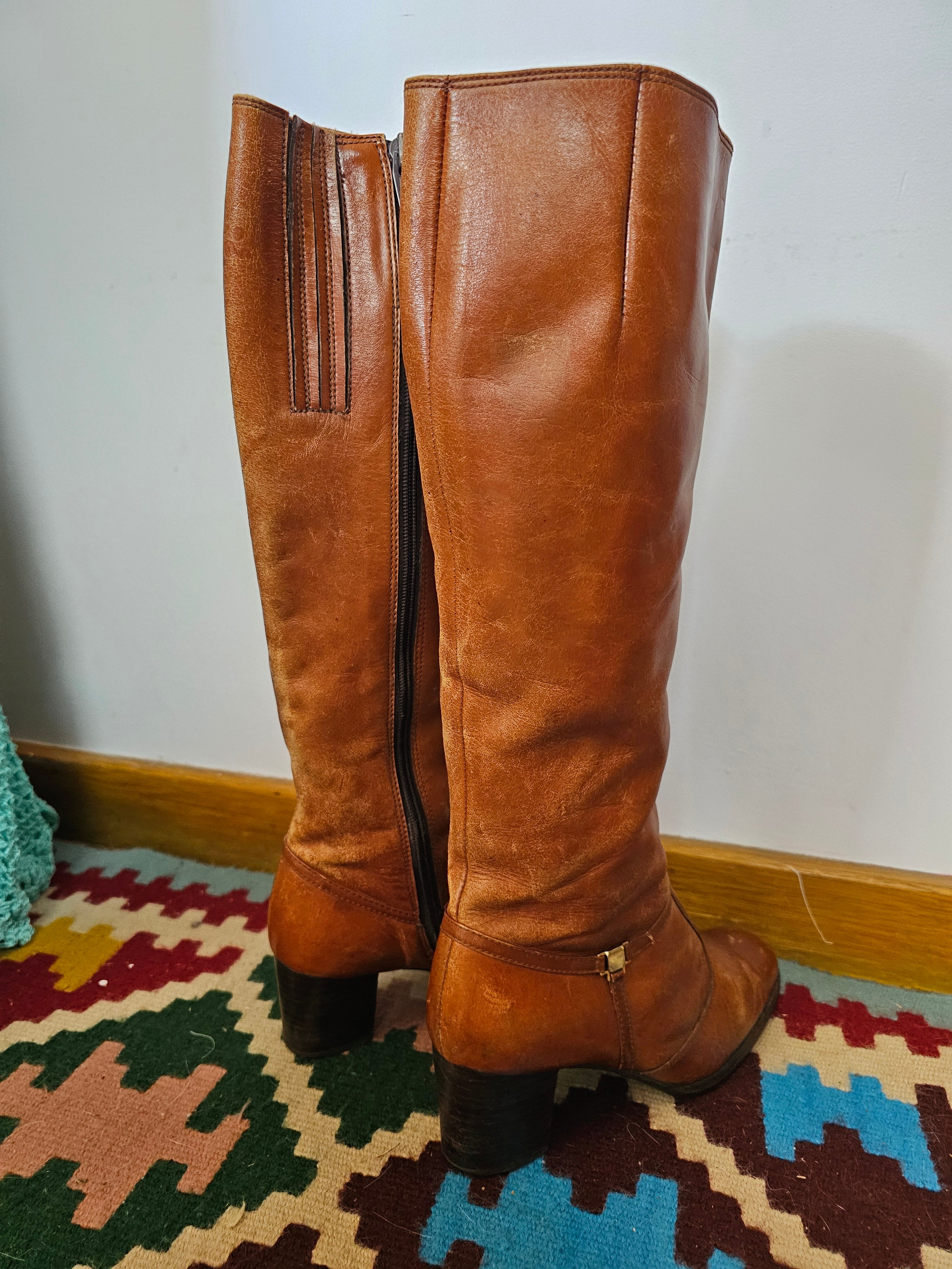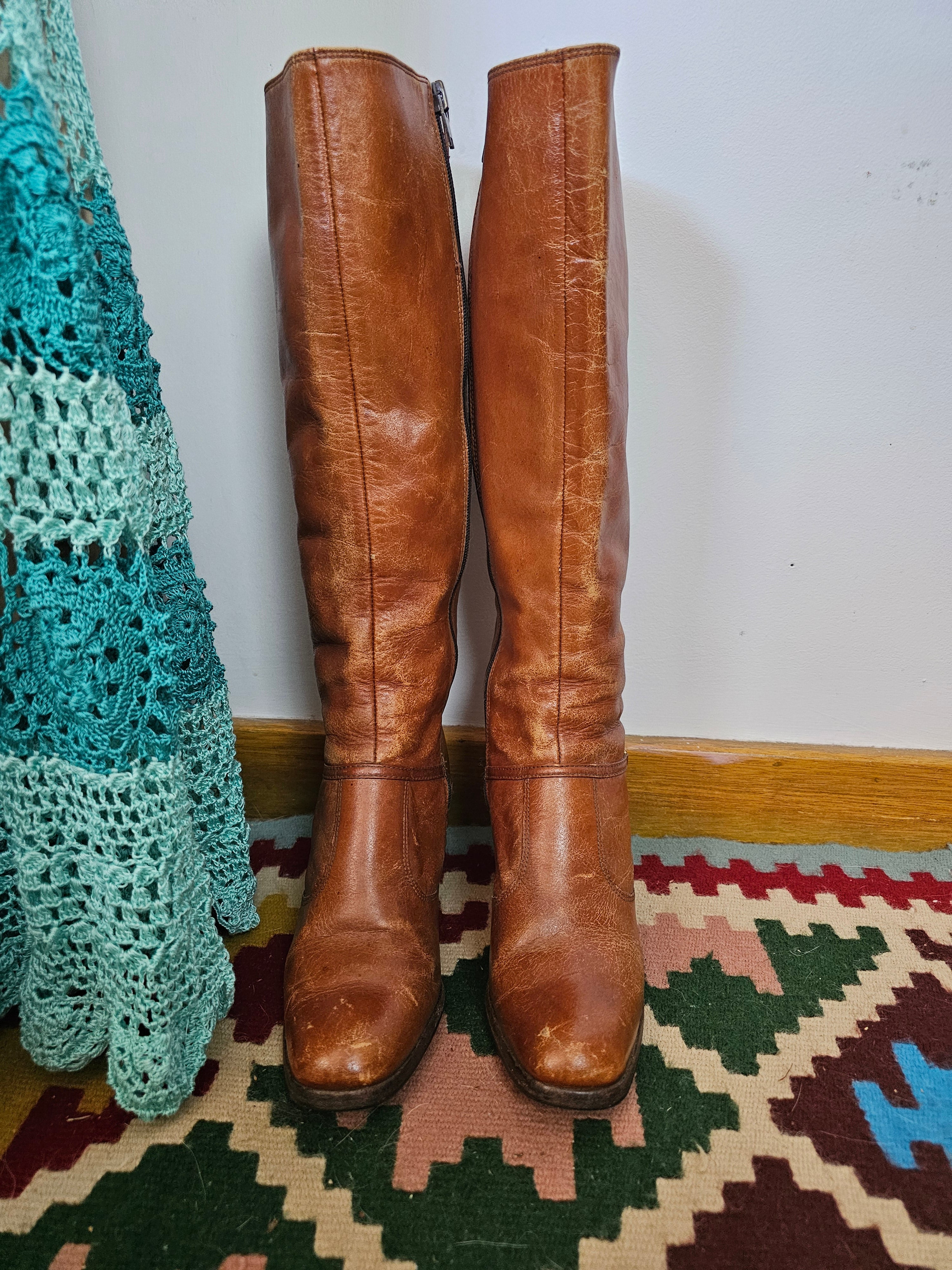 Vintage 70s Leather Knee-High Boots – Worn-In Tan | Size 6.5B