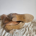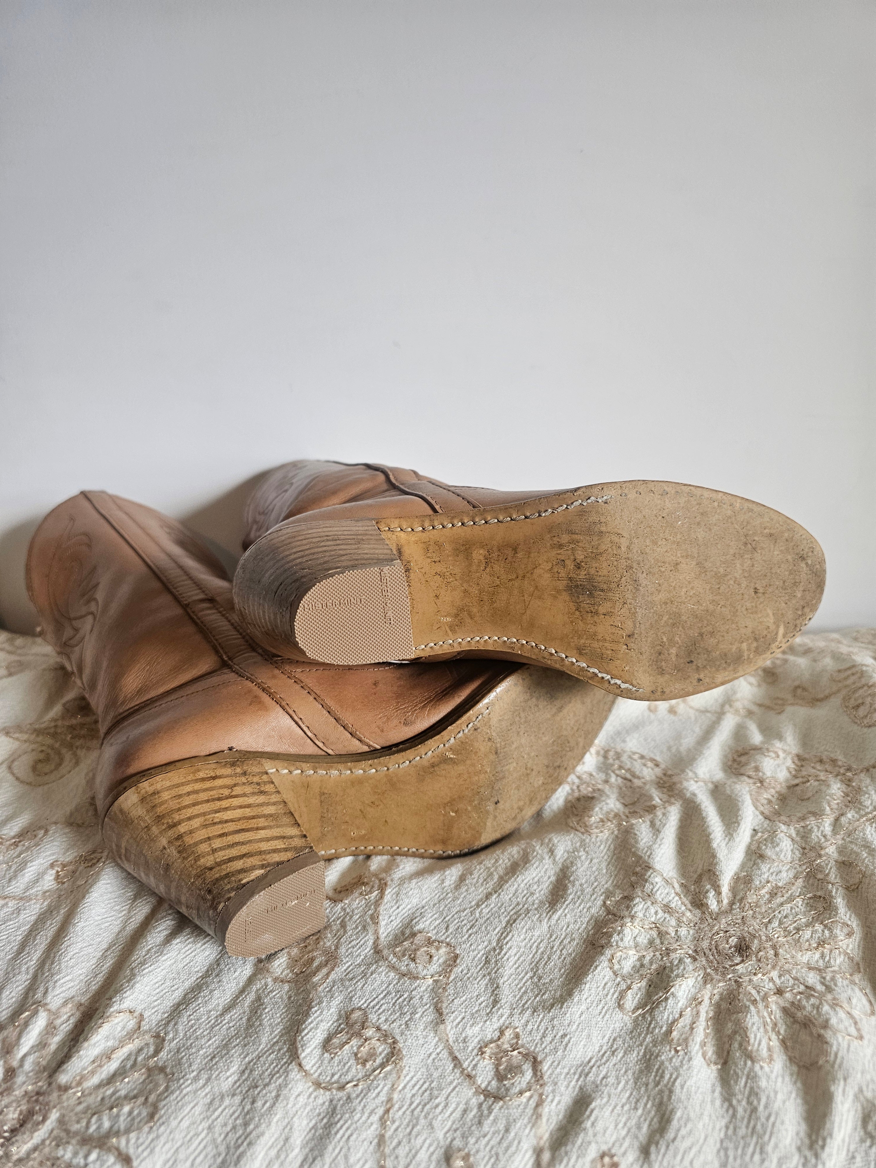 Classic vintage Dingo boots in a gorgeous tan leather, freshly polished with new heel rubber. They’ve got that perfect lived-in western look — small marks, softening and natural wear that only makes them cooler. A true vintage pair with personality.