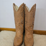 A classic western silhouette with a 70s vibe, these vintage Dingo boots feature soft brown leather, cut-out detailing, and a stacked 3" heel for that timeless cowgirl look.