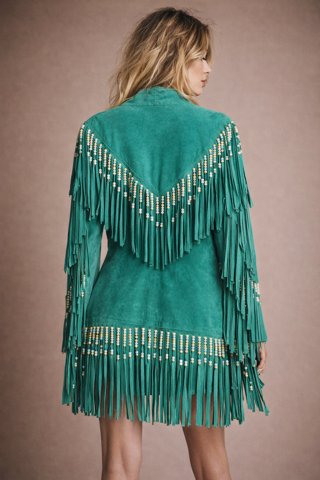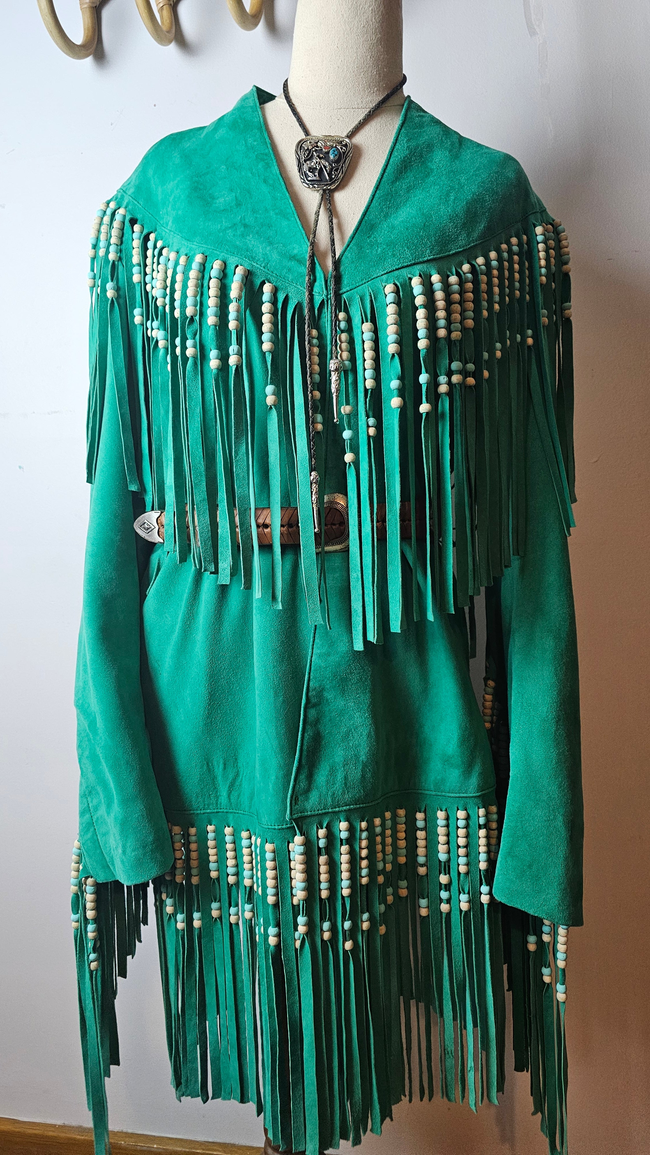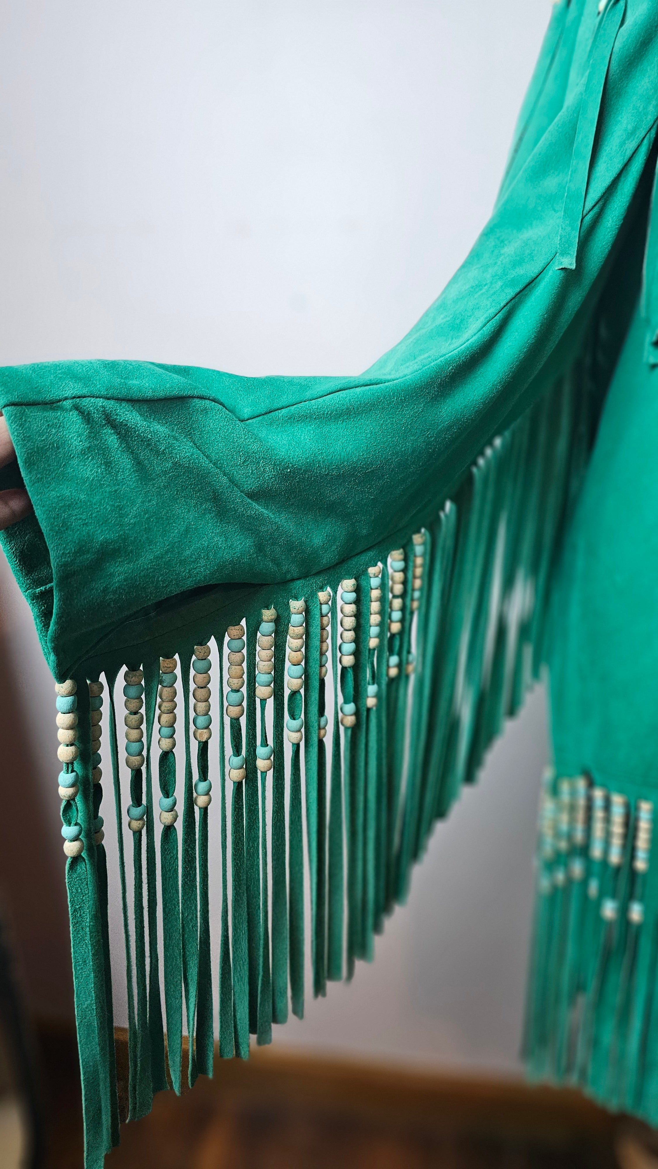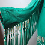 Deep emerald suede, heavy fringe that moves with you, and beadwork that catches the light like you’re walking through dust at golden hour. It’s bold, rare, and has that don’t mess with me but also I look incredible energy.