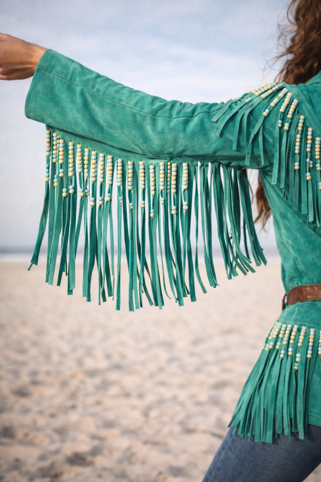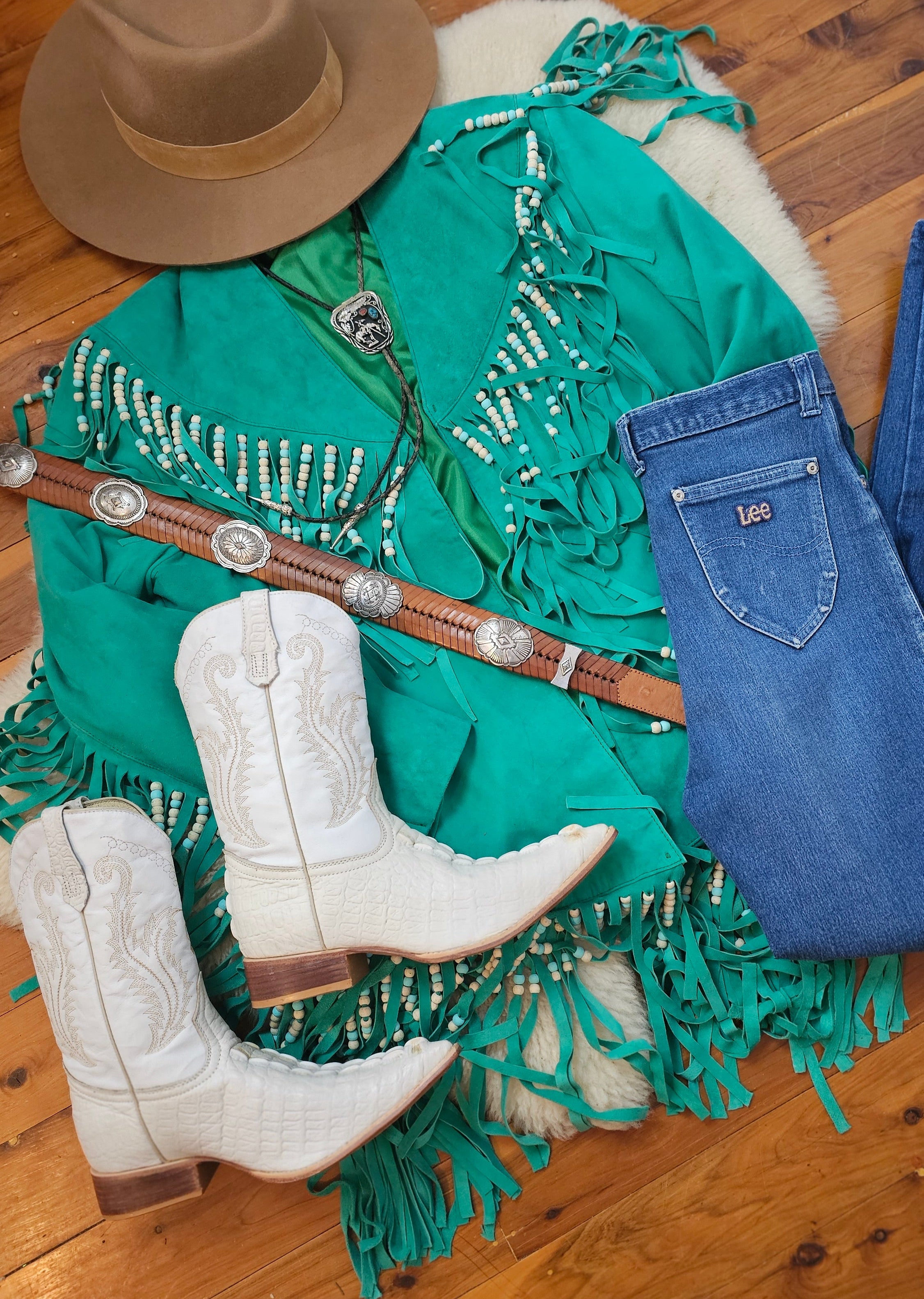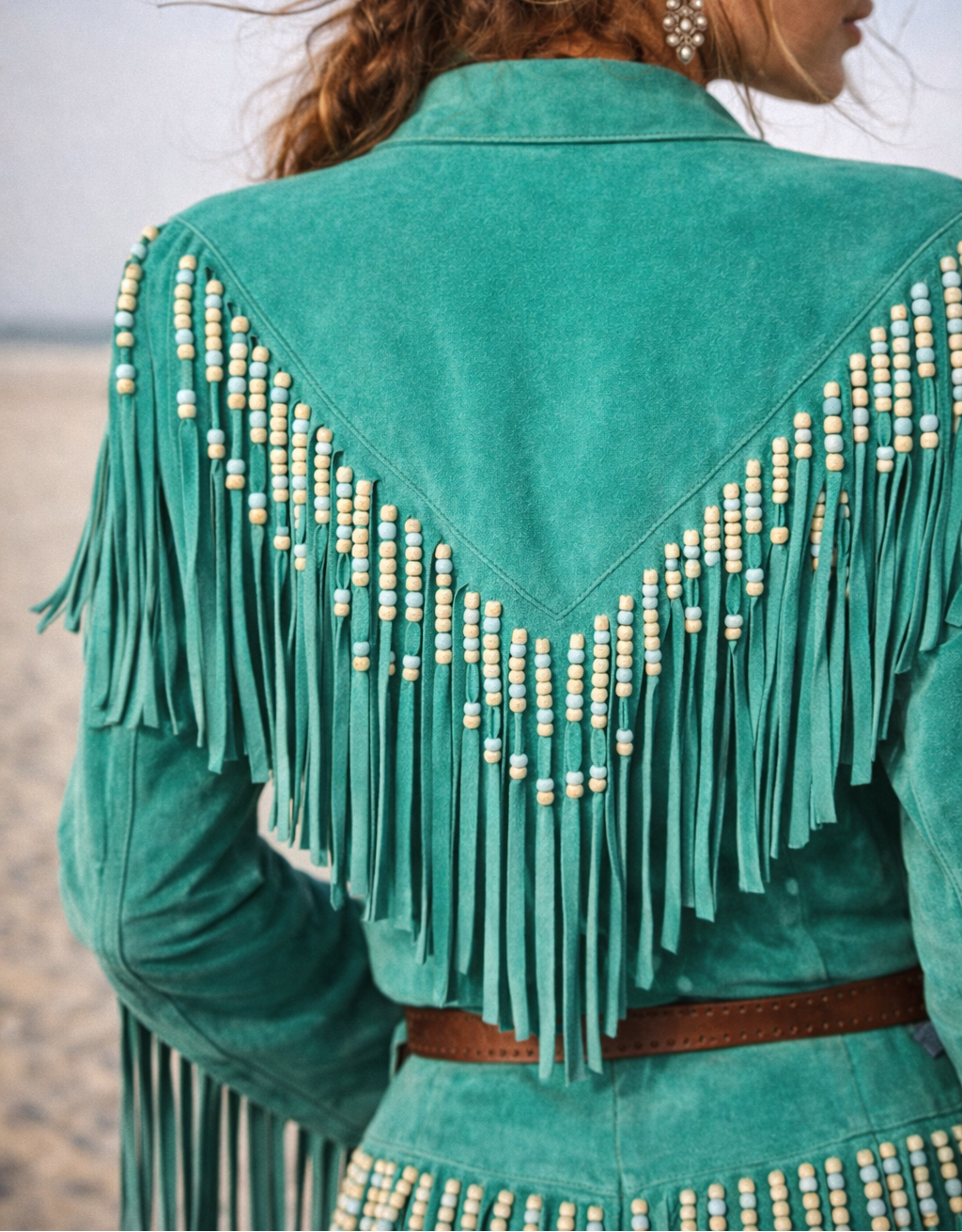 Deep emerald suede, heavy fringe that moves with you, and beadwork that catches the light like you’re walking through dust at golden hour. It’s bold, rare, and has that don’t mess with me but also I look incredible energy.