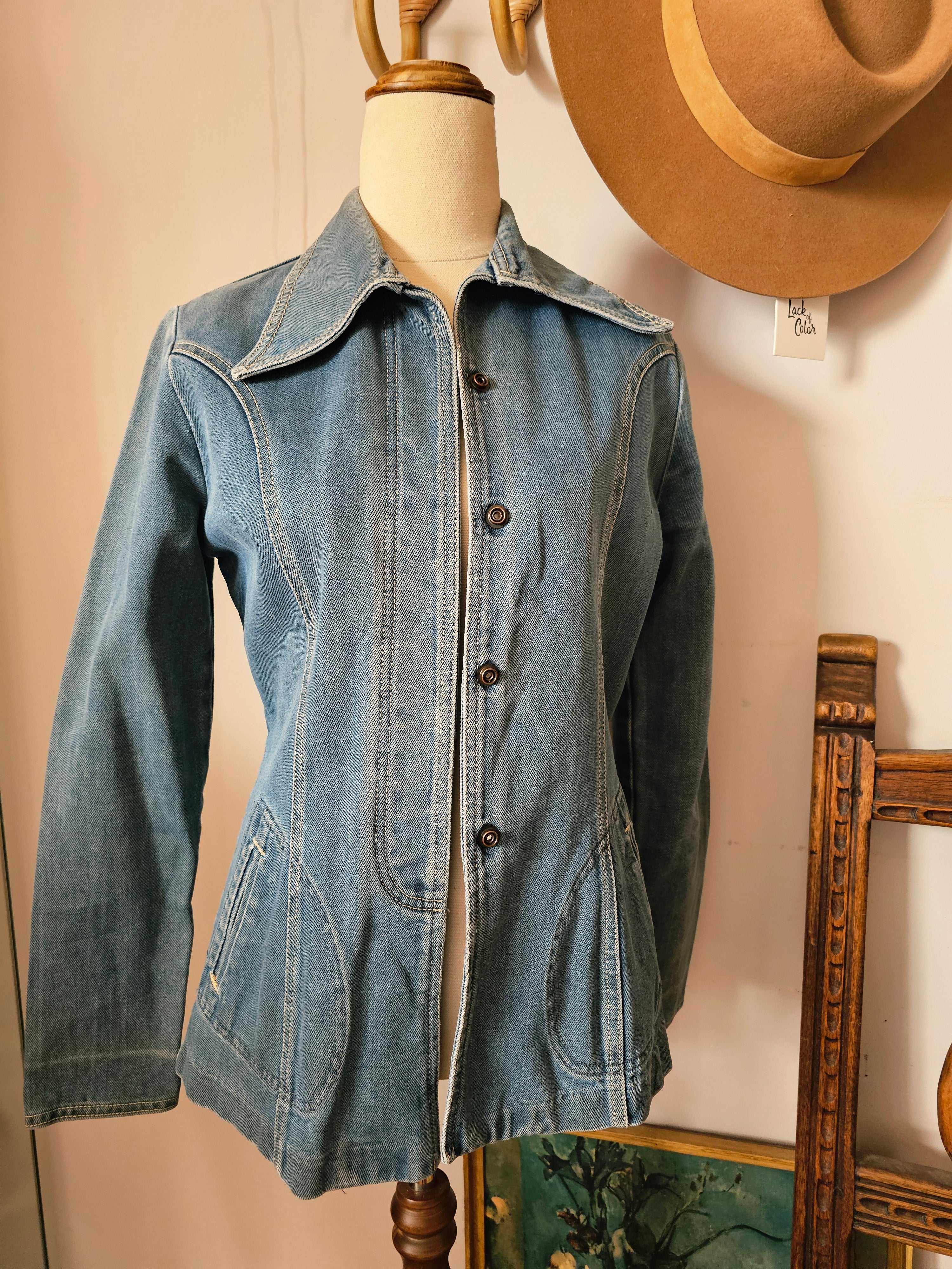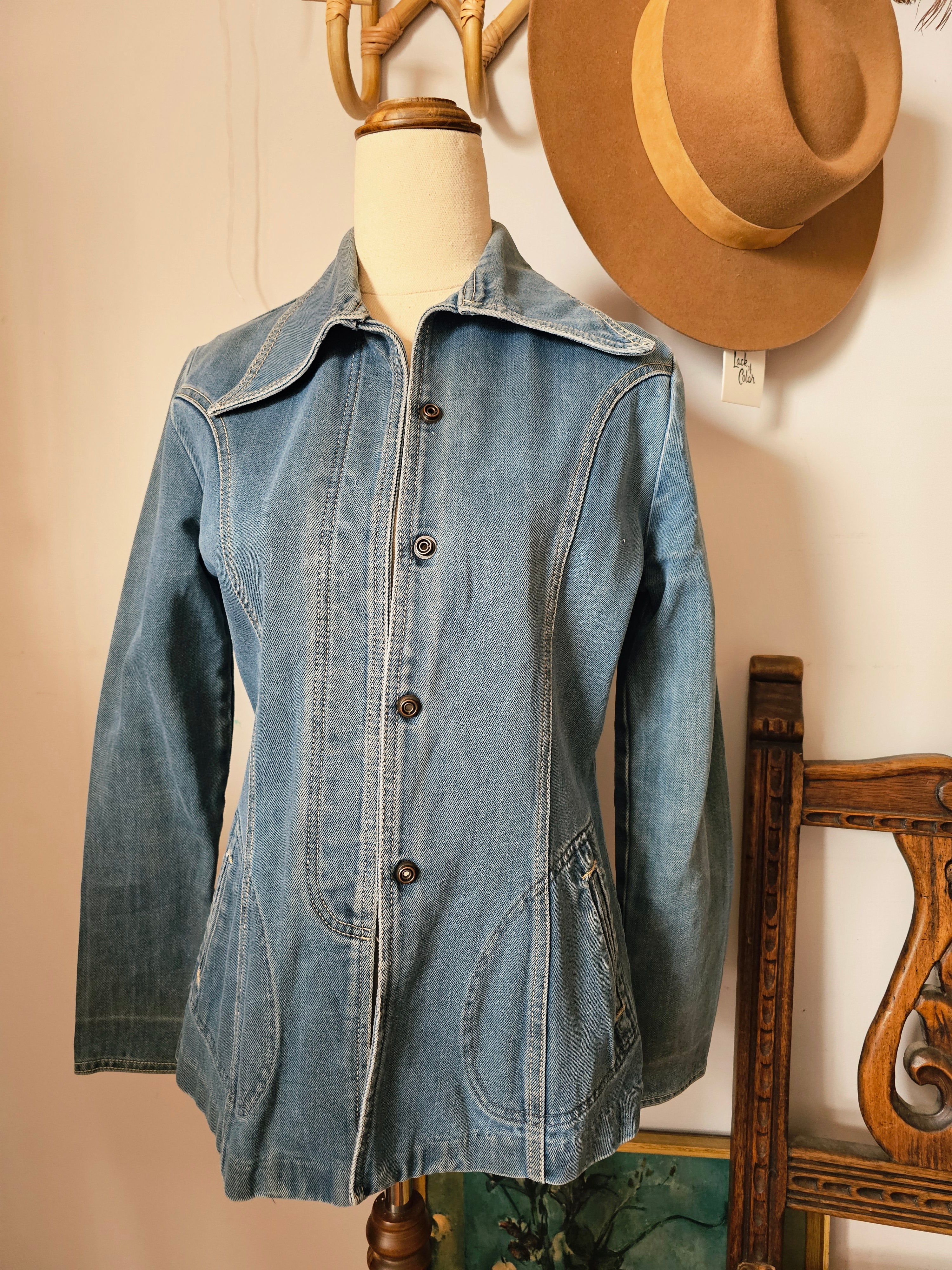 A collectible vintage denim jacket with authentic wear and character, perfect for layering or styling with your favourite flares.