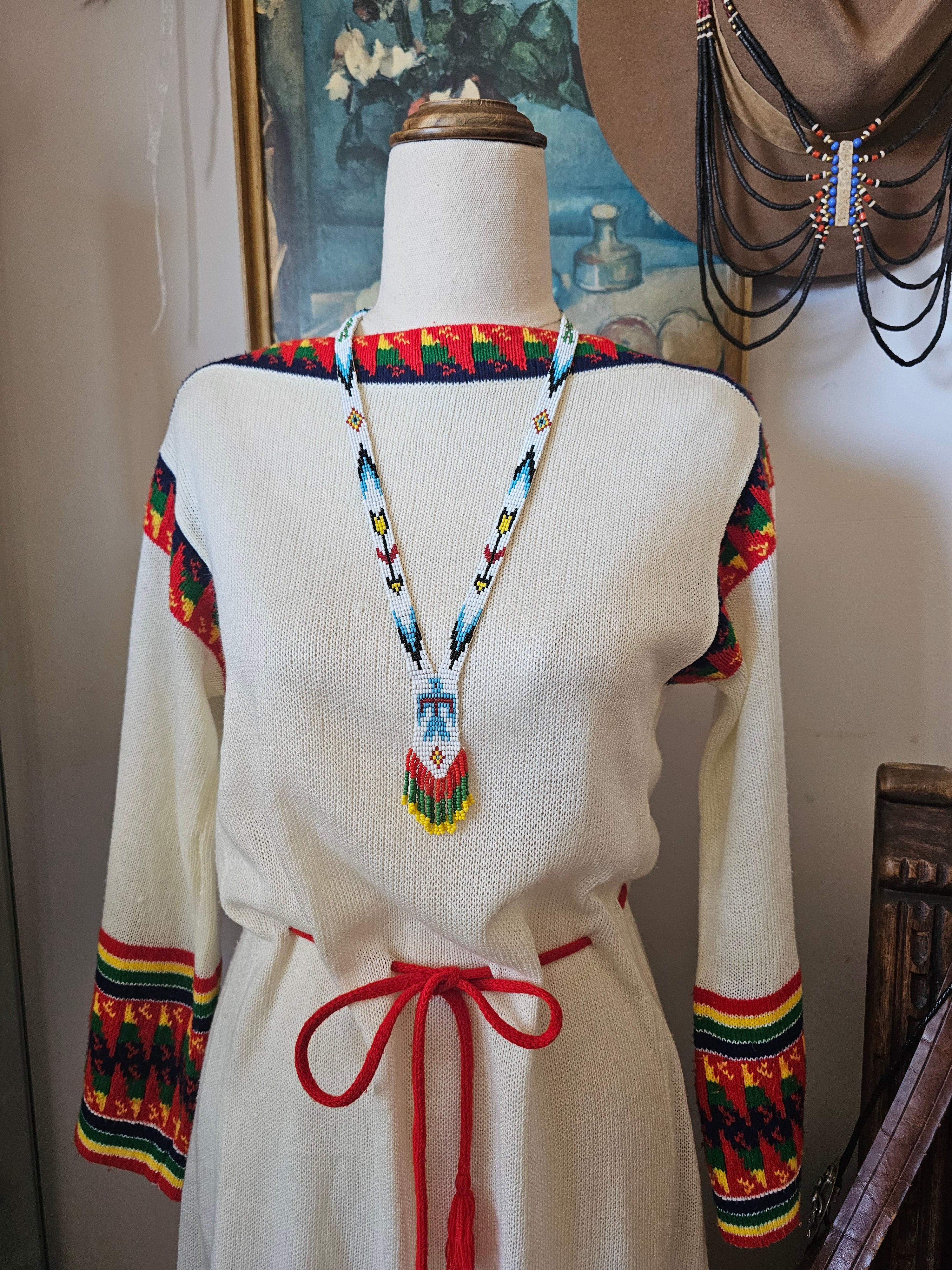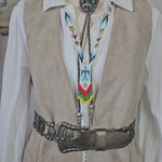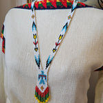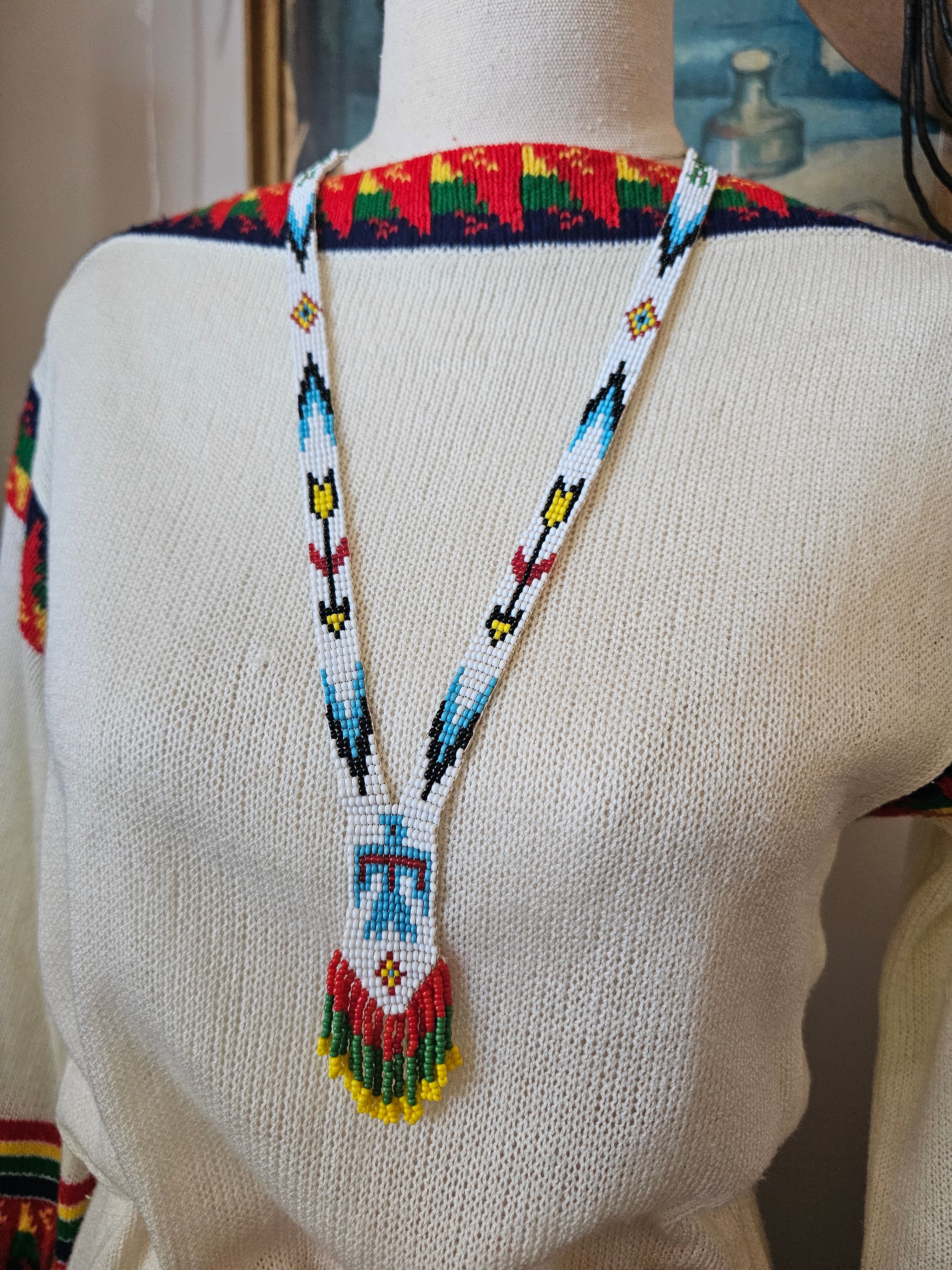This stunning hand-beaded statement necklace is a true work of art. Featuring a bold thunderbird motif and intricate beadwork in turquoise, red, black, yellow, and green, it’s the perfect finishing touch to any boho, festival, or western-inspired look.
