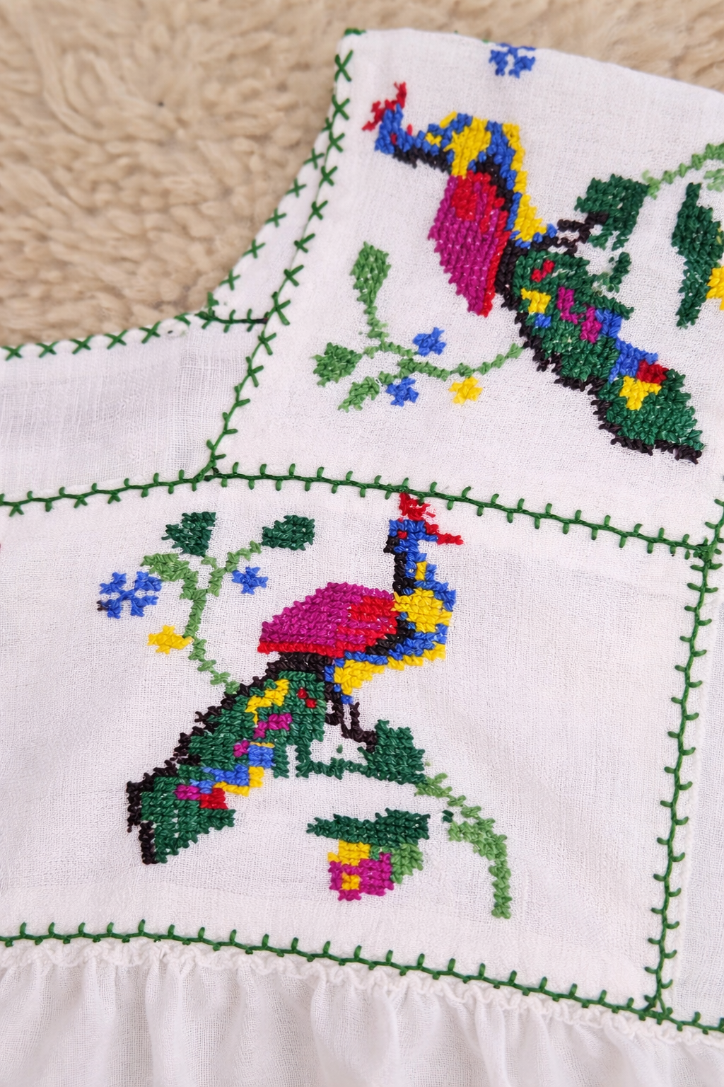 Colourful bird and floral embroidery throughout yoke and sleeves