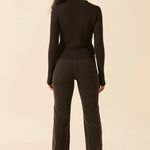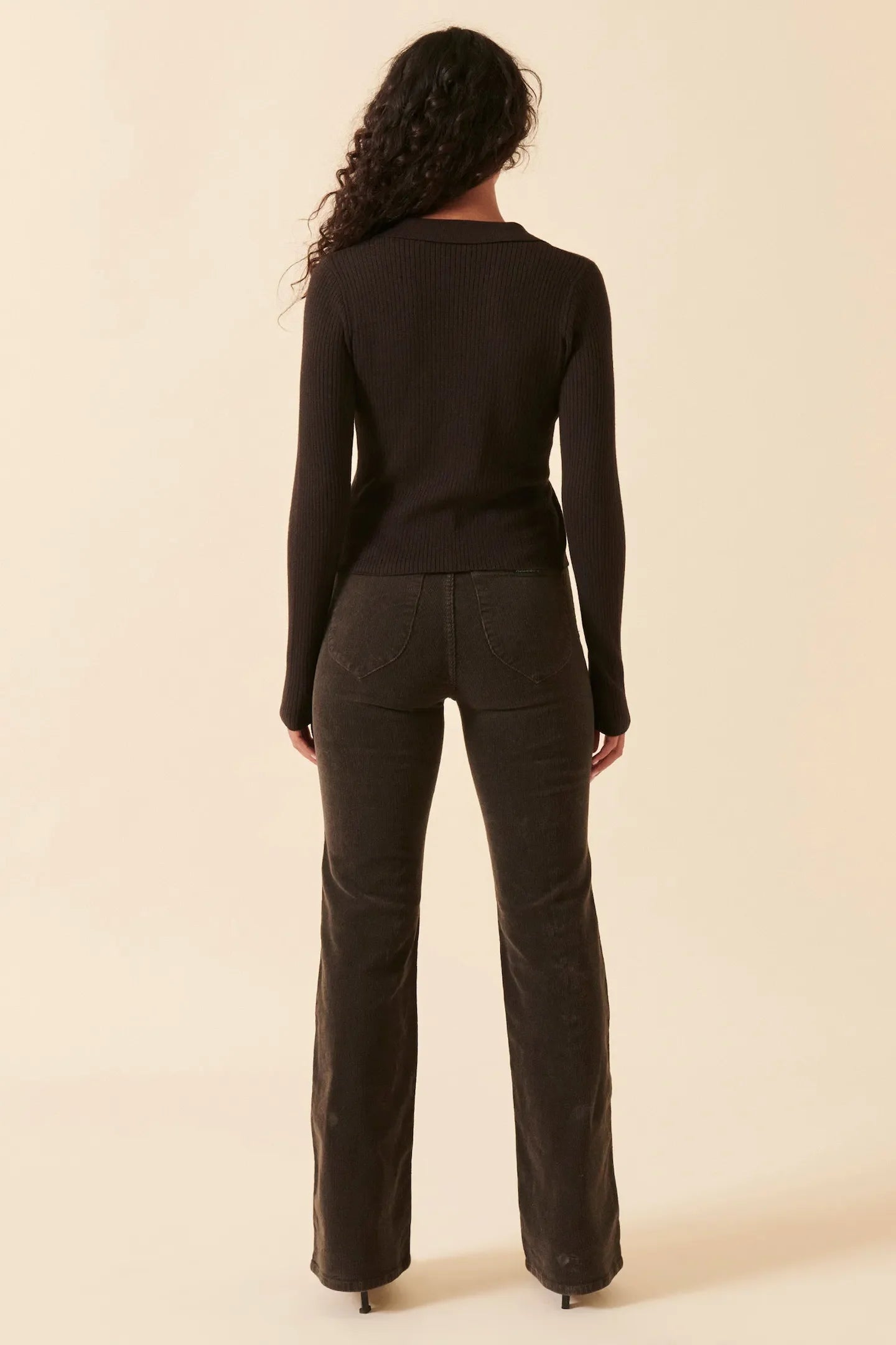 Person wearing brown flared jeans and a black top on a white background