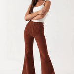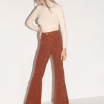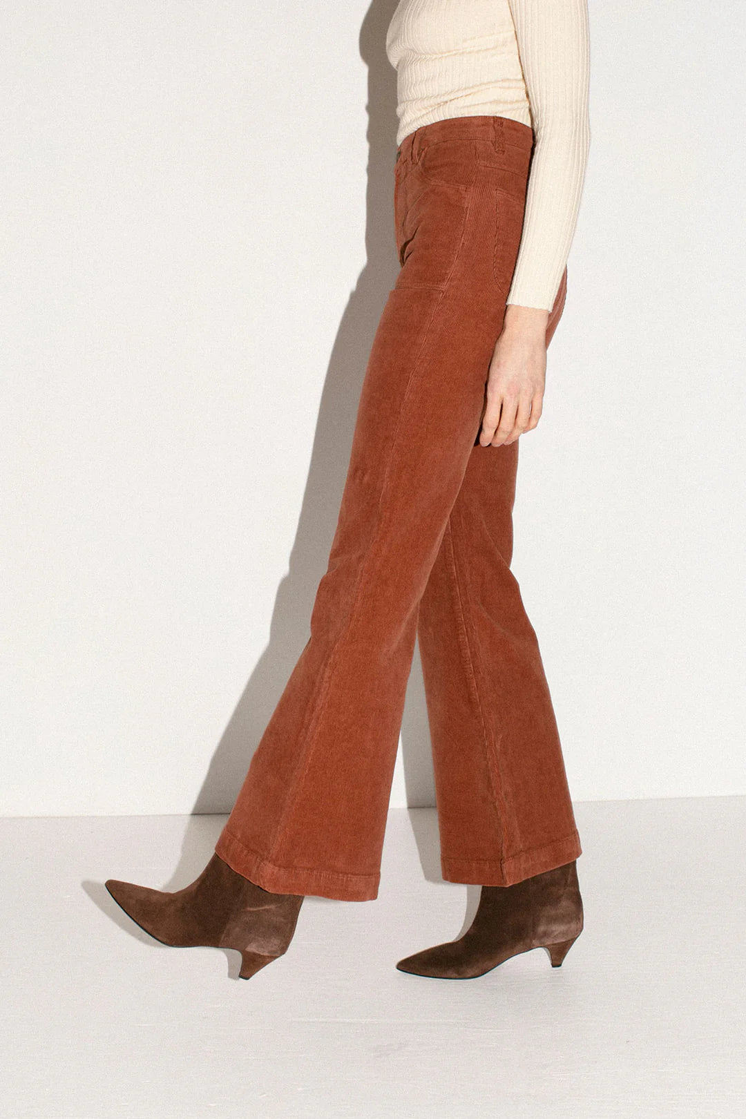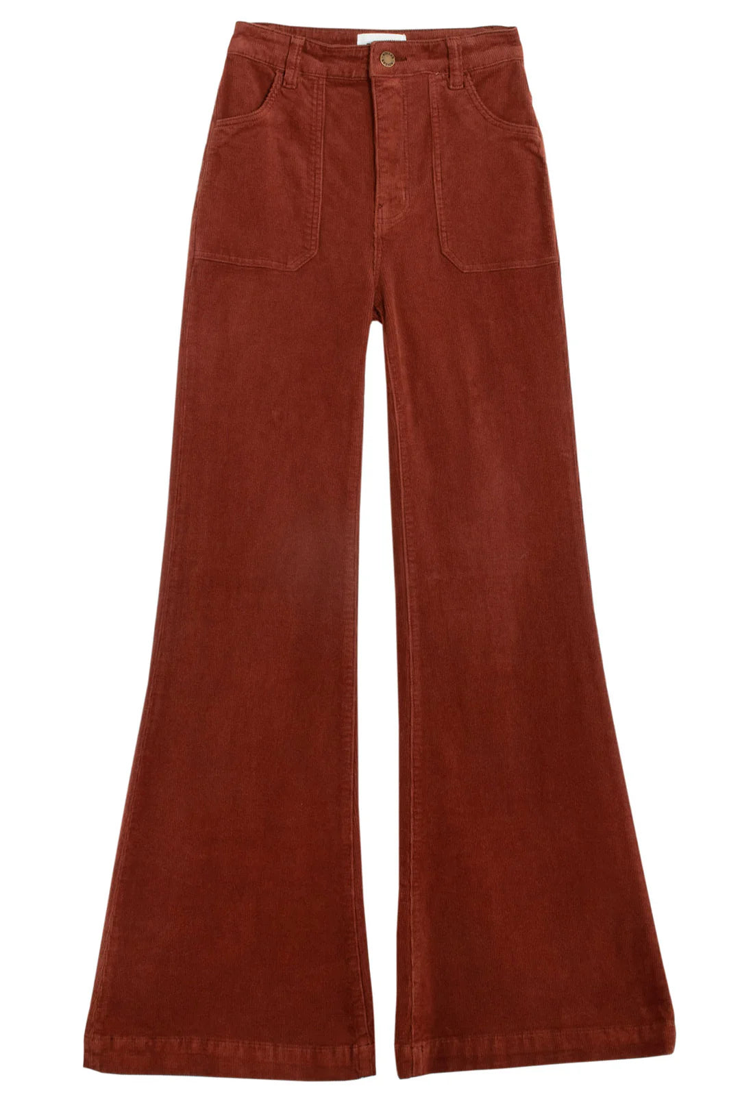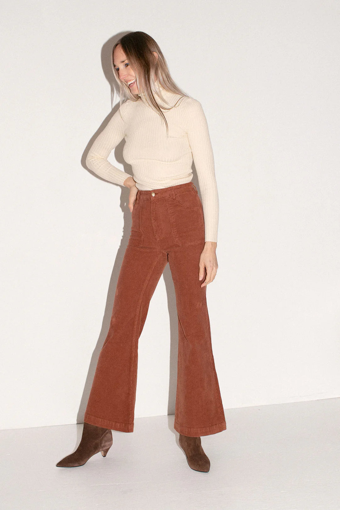 These Rolla’s Eastcoast Flare Cord Jeans in rich Chestnut are a vintage-inspired dream. Featuring a high-rise waist, slim fit through the thigh, and a dramatic flare, they’re designed to flatter and elongate the silhouette. This pair has classic front patch pockets and is crafted in soft stretch corduroy for comfort and shape retention.