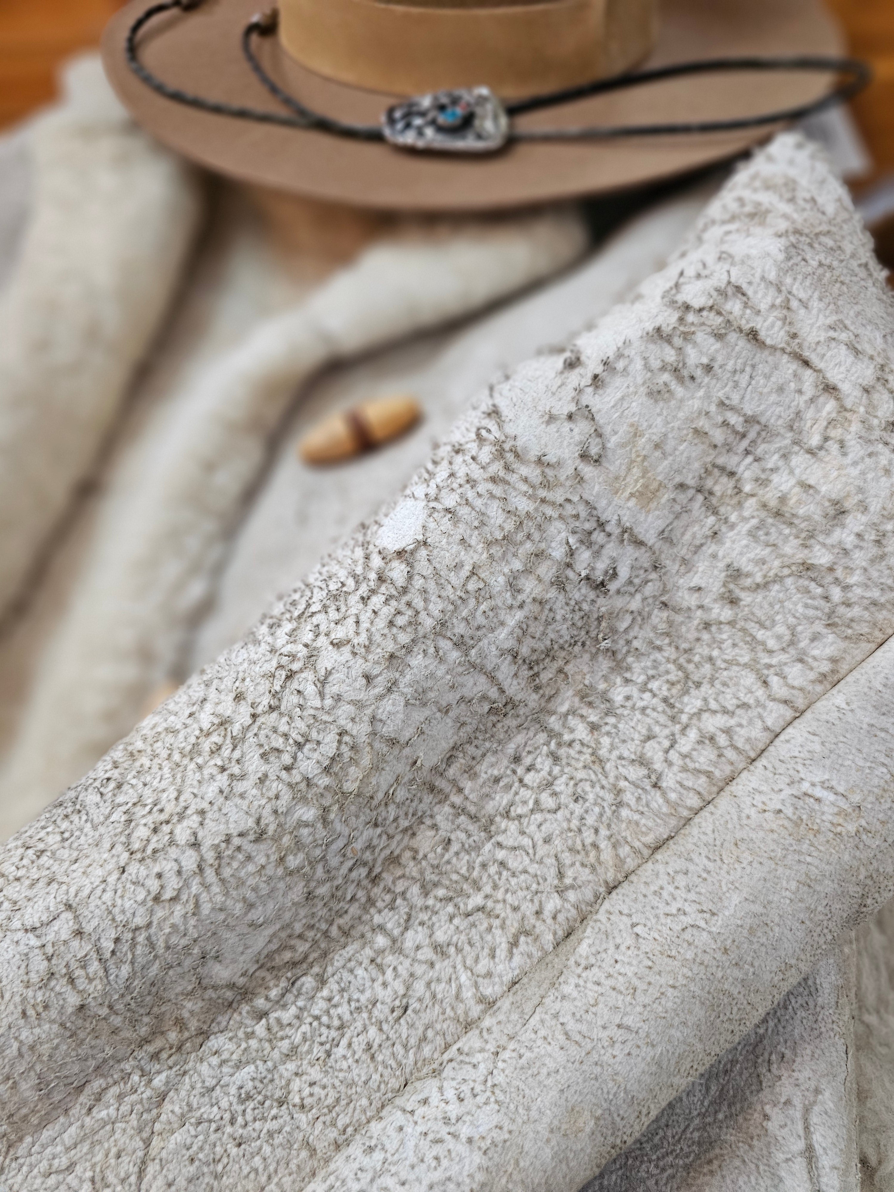 A true vintage piece with that lived-in soul… this shearling coat has a rugged, weathered outer and the softest, creamy sheepskin lining inside. Heavy, warm, and full of character —