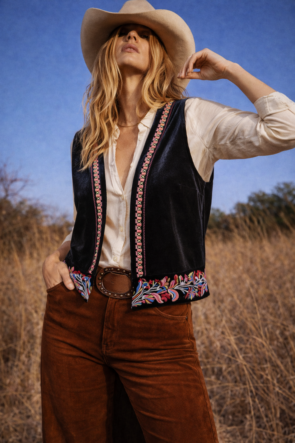 A standout piece with that rich, moody boho feel — this one’s all about texture and detail. The velvet has a soft, luxe finish, balanced by delicate embroidery that gives it that vintage, artisan vibe.